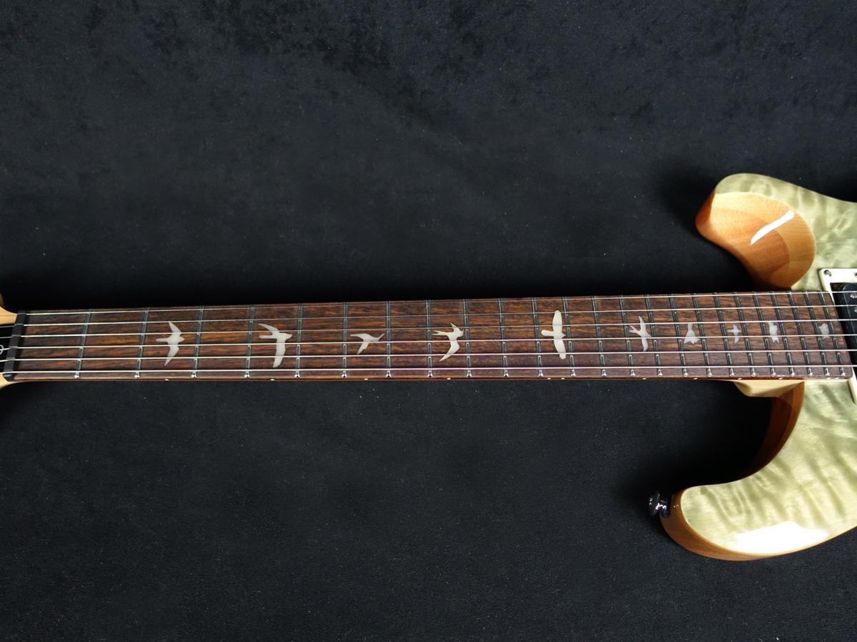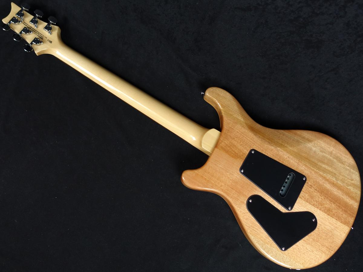 SE Custom 24 Quiltは、マホガニー・バック、メイプル・トップのボディ、Wide Thinカーブのメイプル・ネック、ローズウッド指板、バード・インレイを合わせ、PRSデザインのトレモロ・ブリッジを装備。