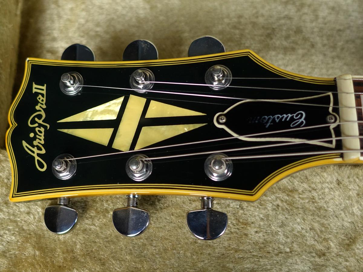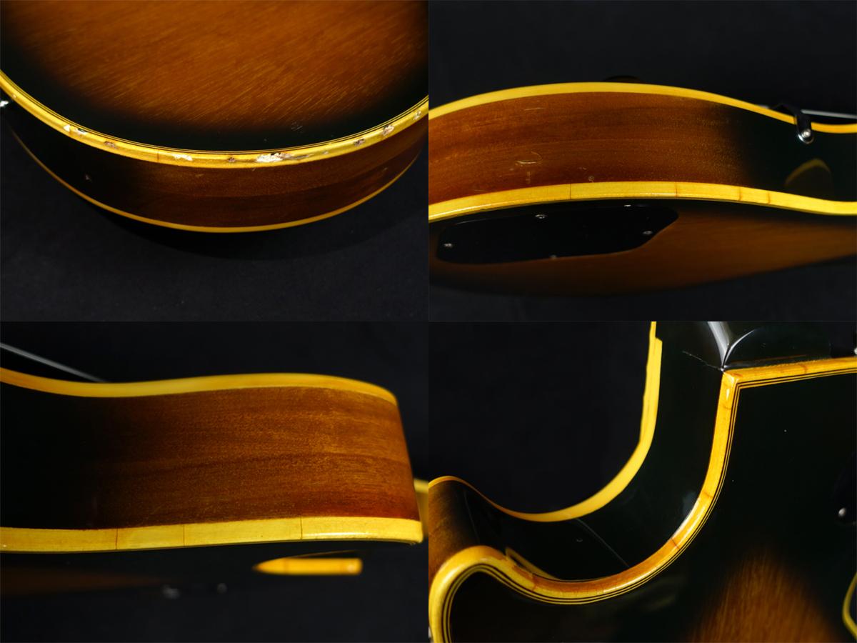 この頃の国産ギターではもはや宿命的とも言えるバインディングの劣化による崩壊が見受けられる他、全体的に使用に伴う弾きキズ、打痕、ジャックプレートのヒビ割れ、パーツの錆びやくすみも散見される等、年式相応の使用感があります。