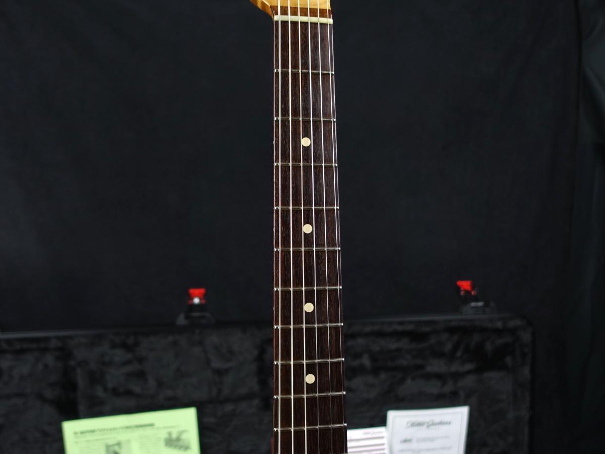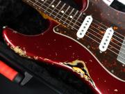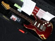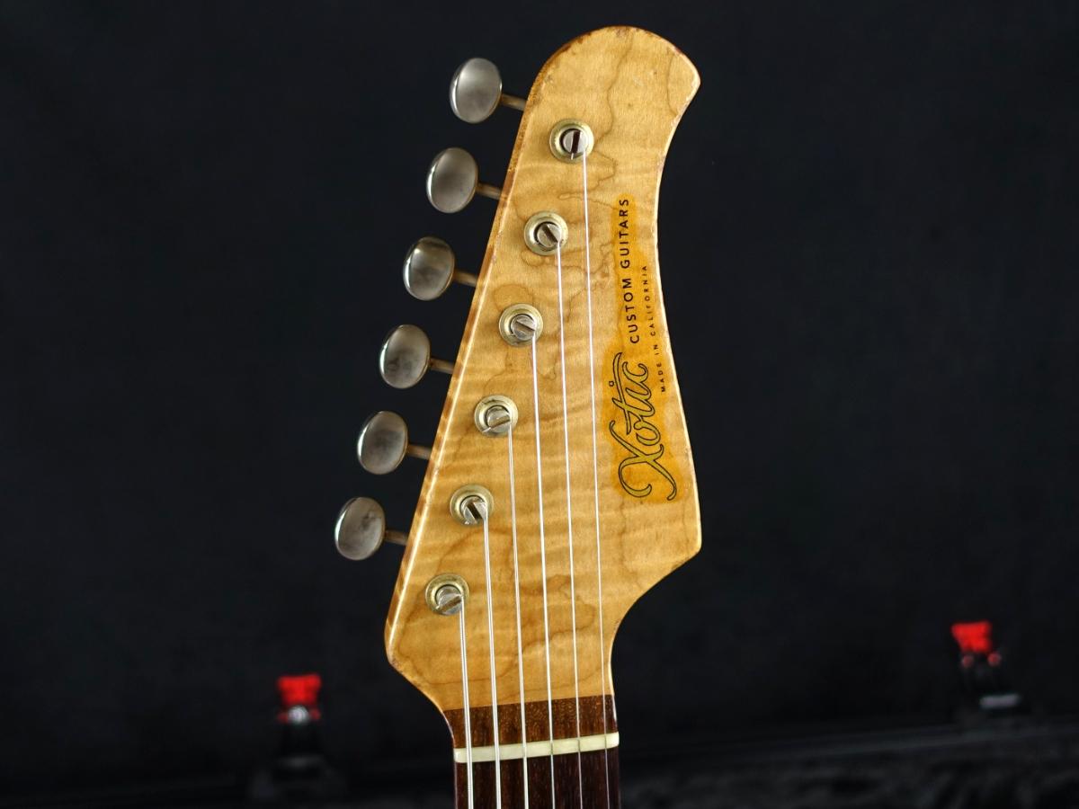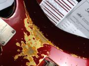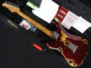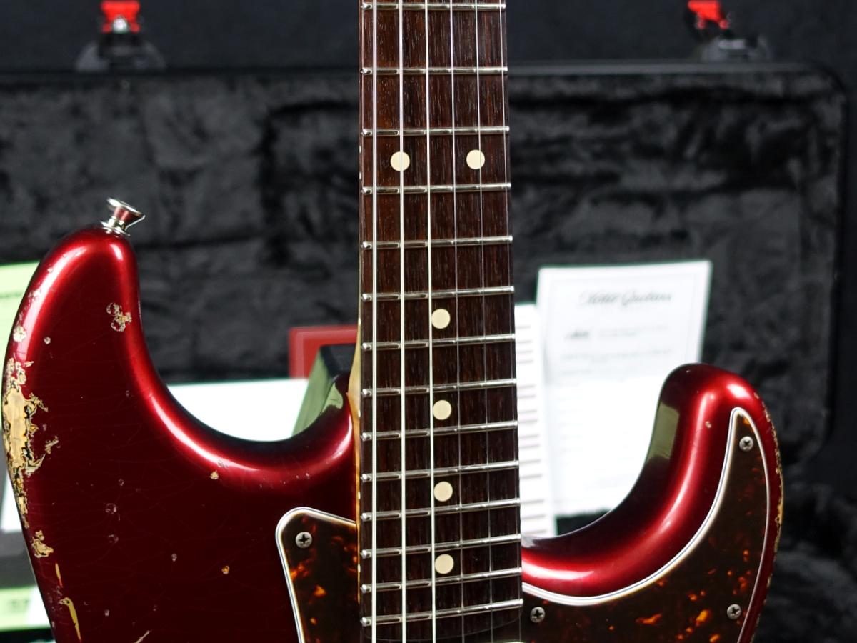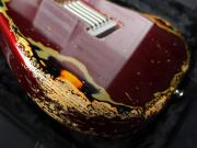 カラーは60年代前期を彷彿とさせる、渋い3-Tone Burstカラーにマルチレイヤー仕様となっており、トップ面にDark Candy Apple Redカラーが採用されておりゴールドの下地など、ヘビーエイジドと相まって派手に仕上がりつつ・クールな出立が良い塩梅のエイジドが雰囲気の良さを引き立たせる1本です。