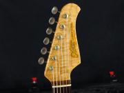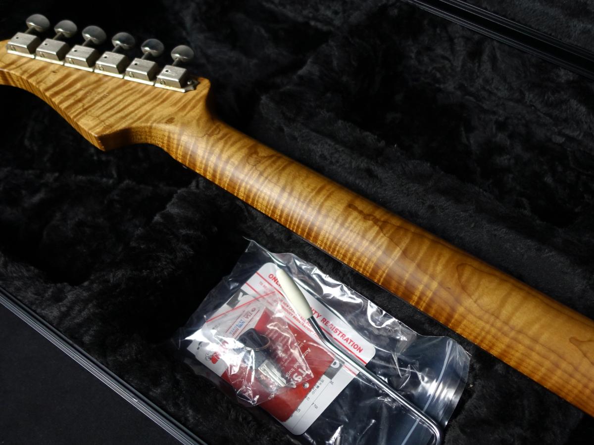 アッシュボディ、ロースウッド指板にネック材には贅沢にローステッド・フレイム・メイプルネックを採用、王道のストラトキャスターのウッドマテリアル。