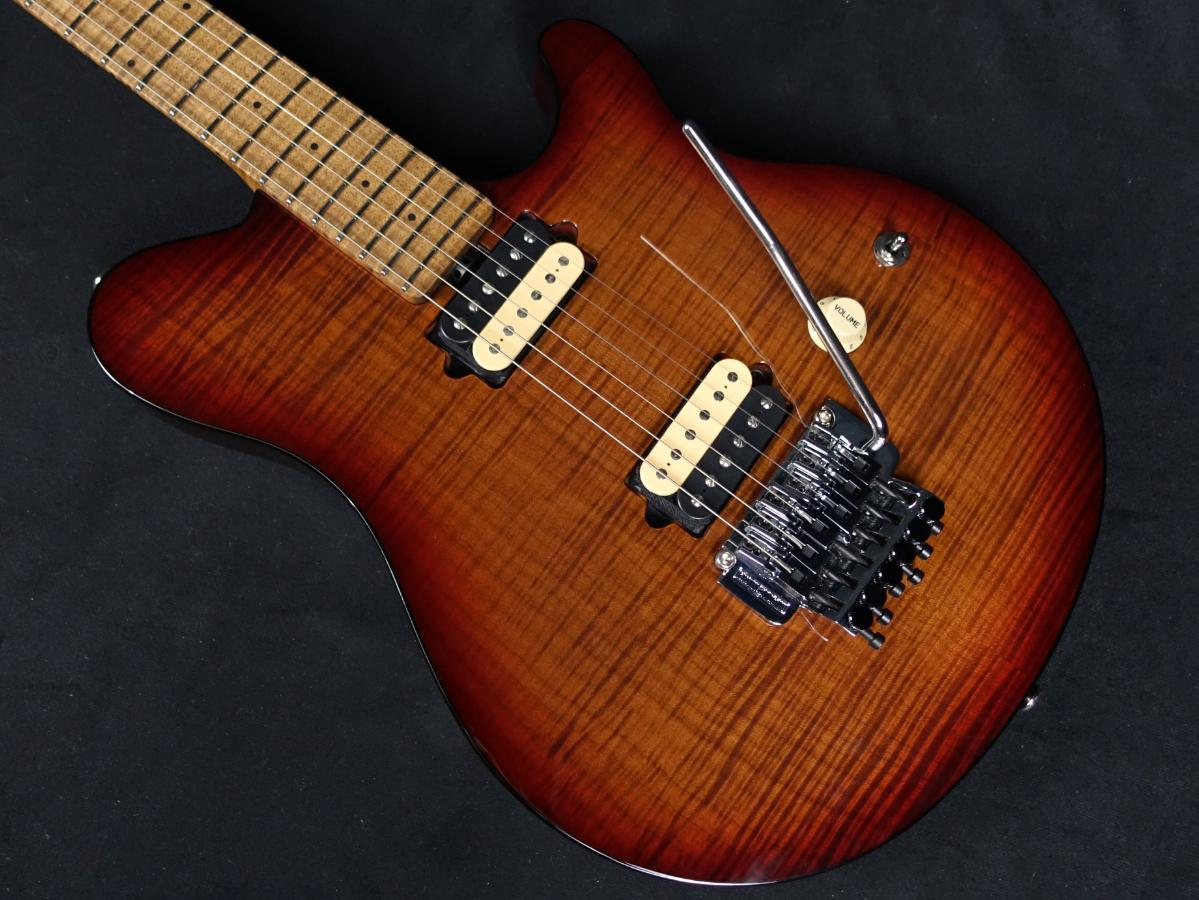 本機はミュージックマン社を代表する"AXIS"にフィギュアドローステッドメイプルを採用しております。