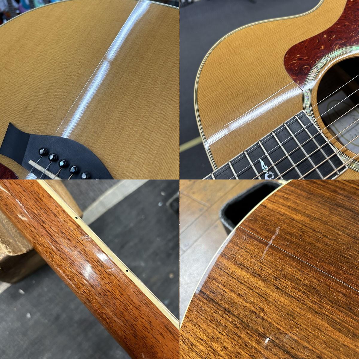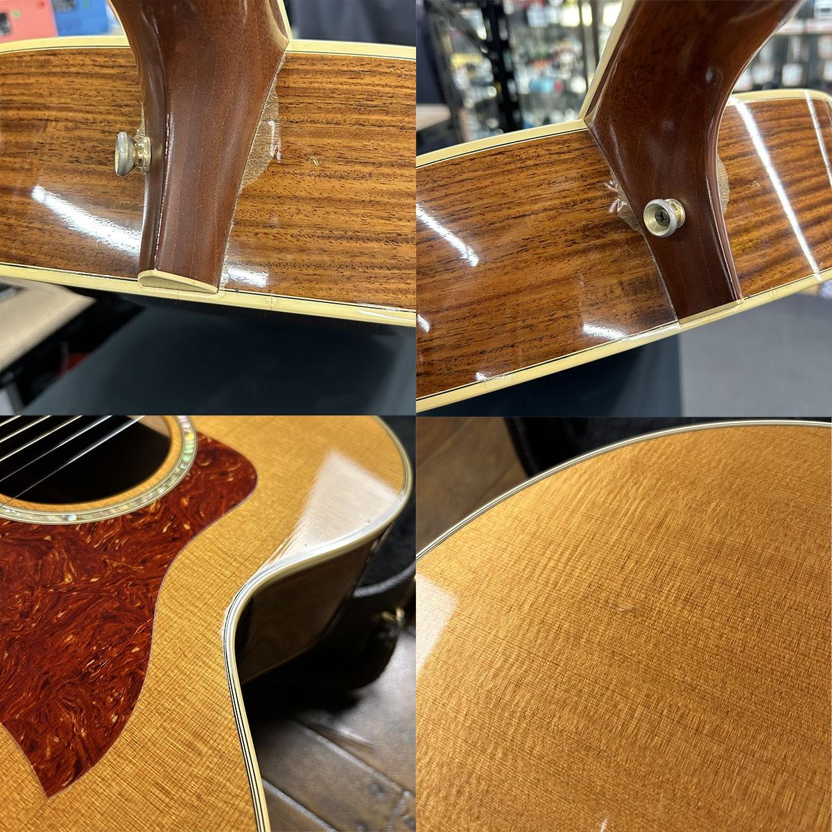 ボディトップブリッジ下からエンドにかけてとピックガード上部分の2個所、トップ割れ補修跡がございます。
