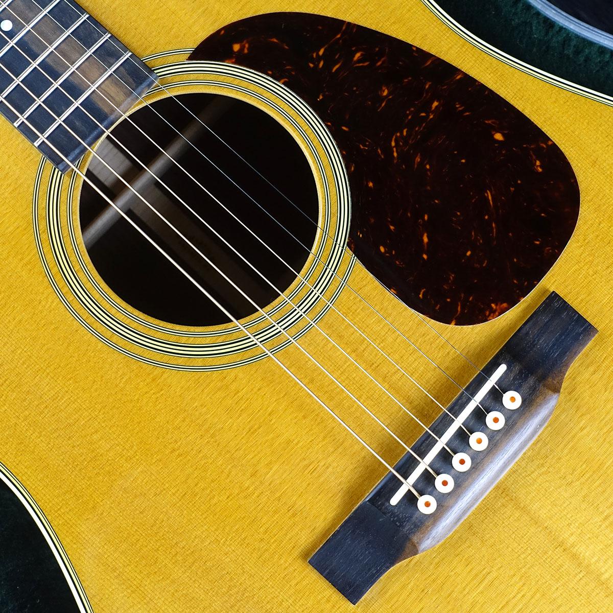 べっ甲柄ピックガード、バタービーンズボタンのオープンギアペグ、オールドスタイルのロゴなどヴィンテージライクなルックスを帯びつつもフォワードシフテッドブレーシングパターンやハイパフォーマンステーパーネックなどモダンな仕様となっています。