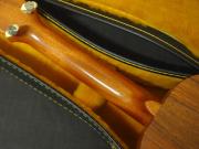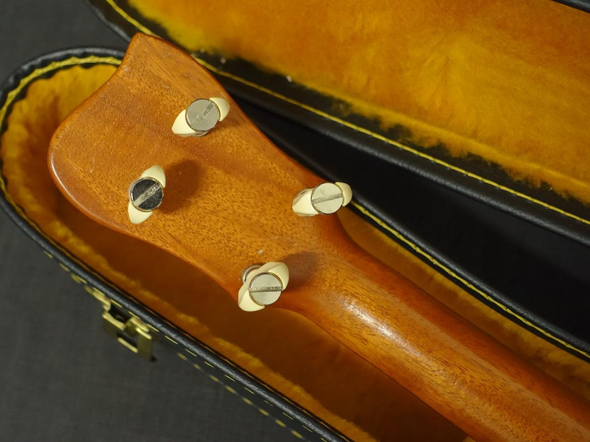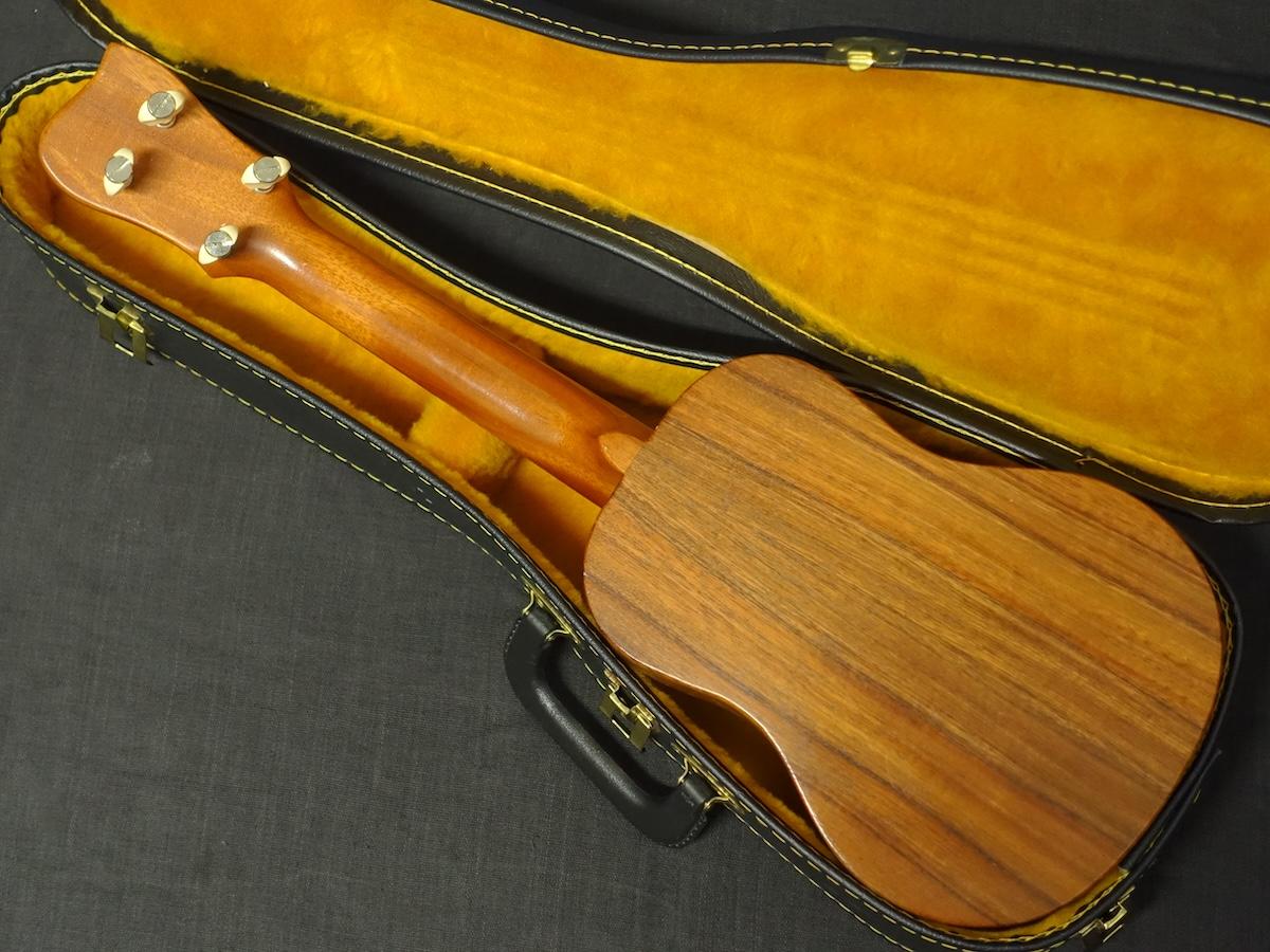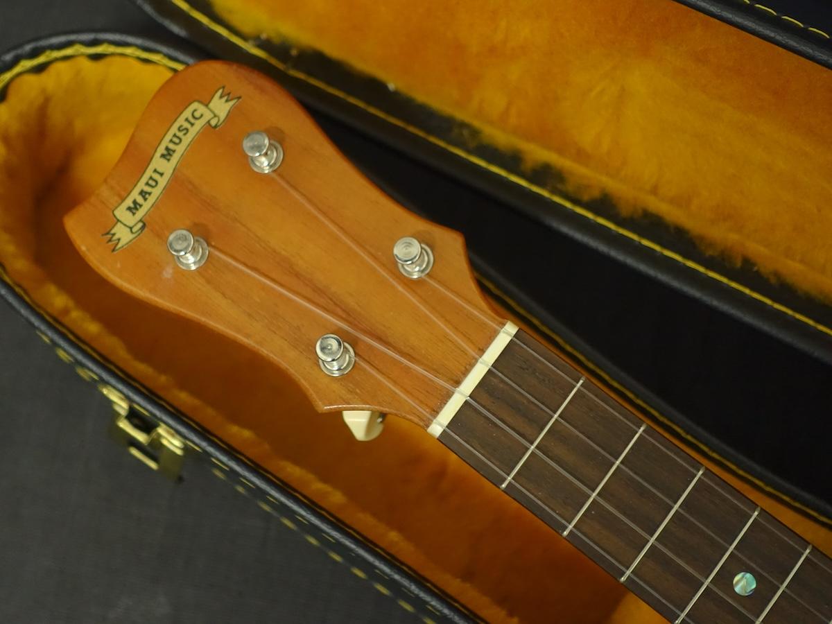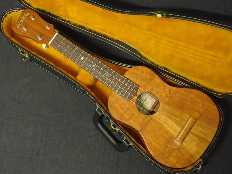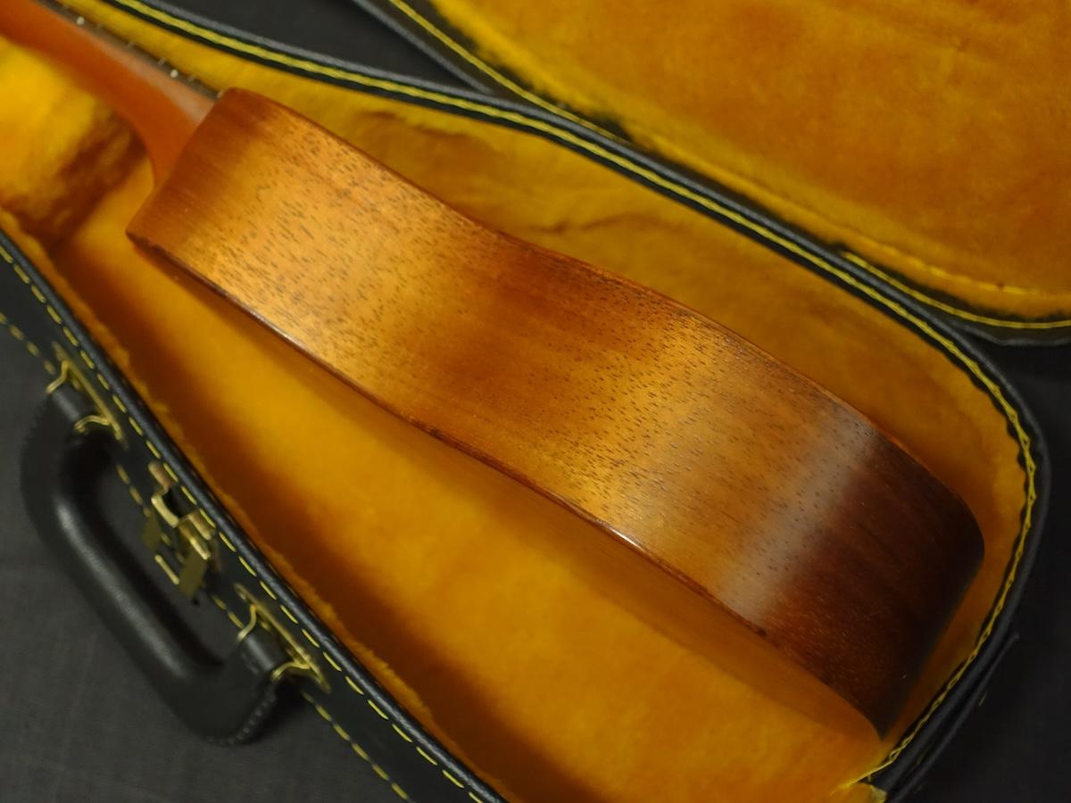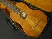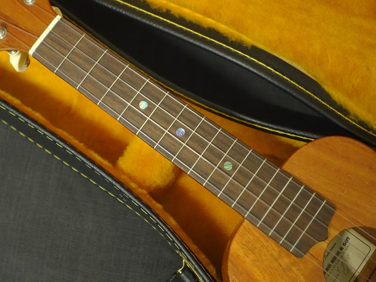 詳細な資料が無い為外観からの判断となりますが、おそらくハワイアンコアを使用したボディ&ネックにローズウッド指板をセットしたウッドマテリアル。トラディショルなデザインのモデルです。