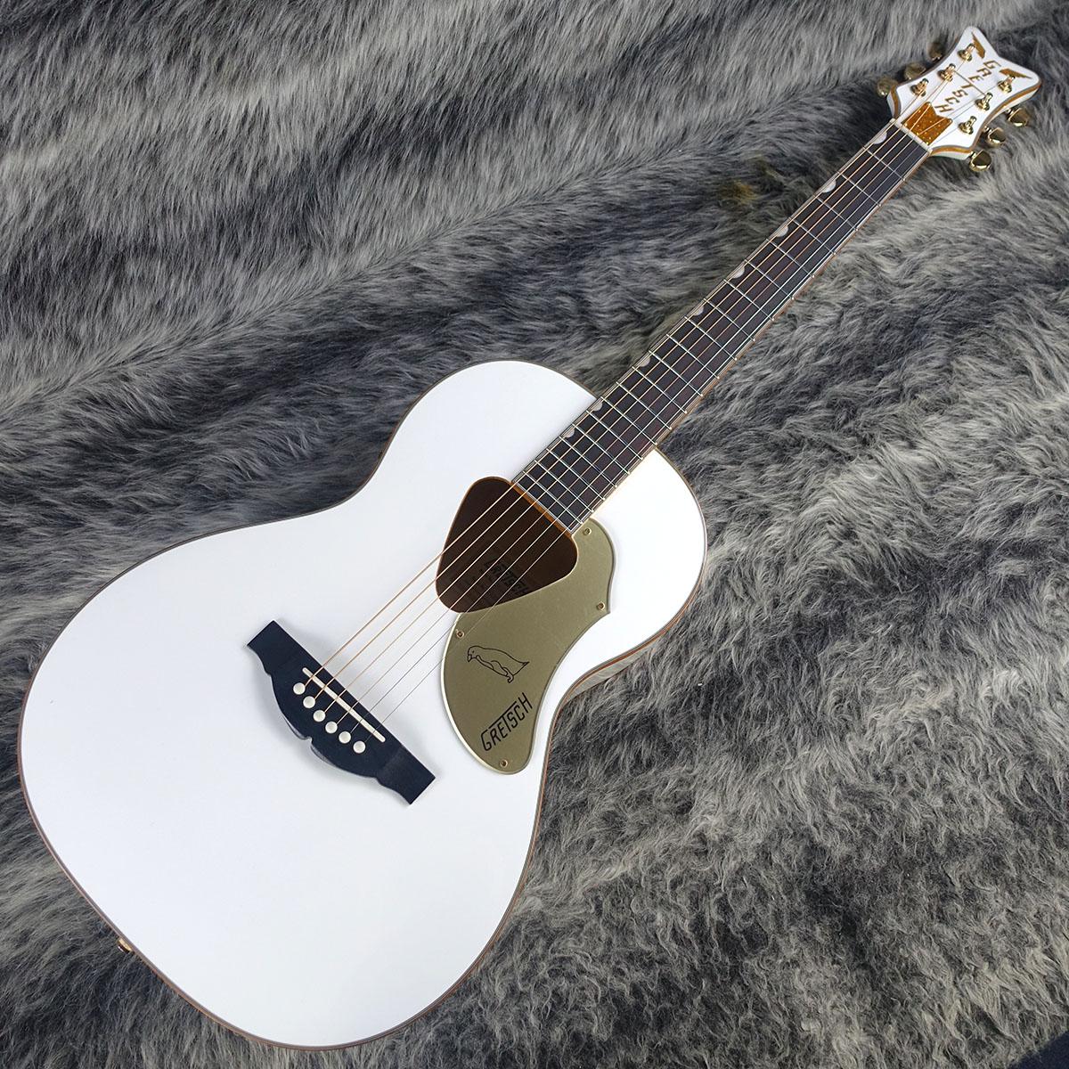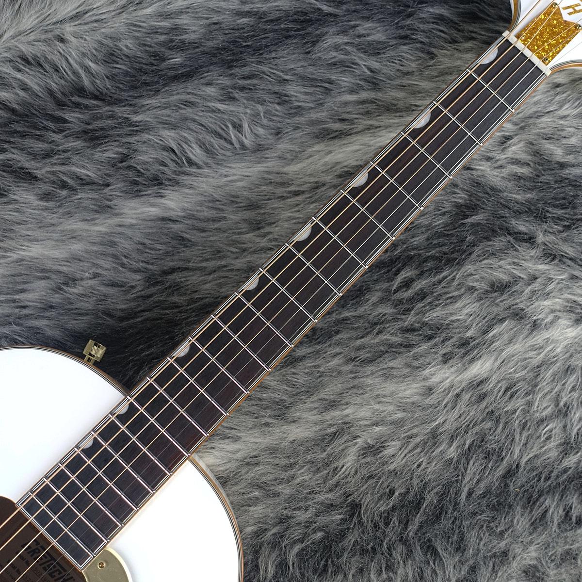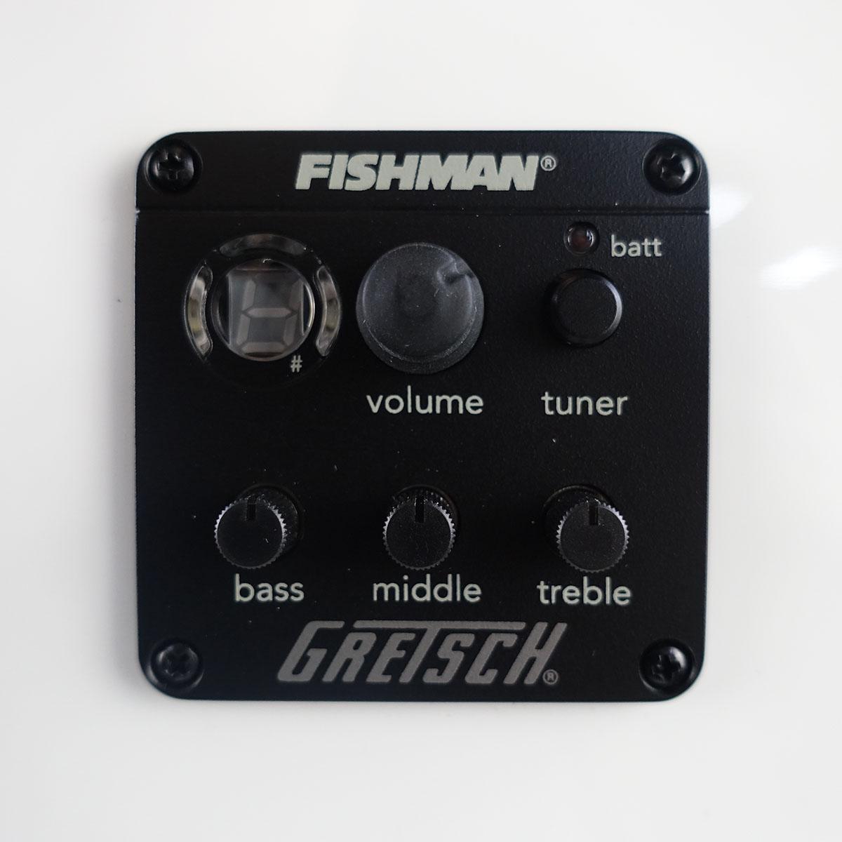 ソリッドスプルーストップ、メイプルバック&サイド、20本のヴィンテージスタイルフレットとパーロイドNeo-Classicサムネイルインレイ、シンセティックボーンナットを備えた12インチラジアスのローレル指板のマホガニーネック、ローレルブリッジ、ゴールドスパークルバインディングと羽付き縦Gretschロゴヘッド、ゴールドプレキシピックガード、ゴールドハードウェアといったステージでの存在感を高めるプレミアムな仕様に加えFishman Presys IIIプリアンプシステムを搭載し、クラシックなスタイリングをモダンなサウンドで引き立てます。
