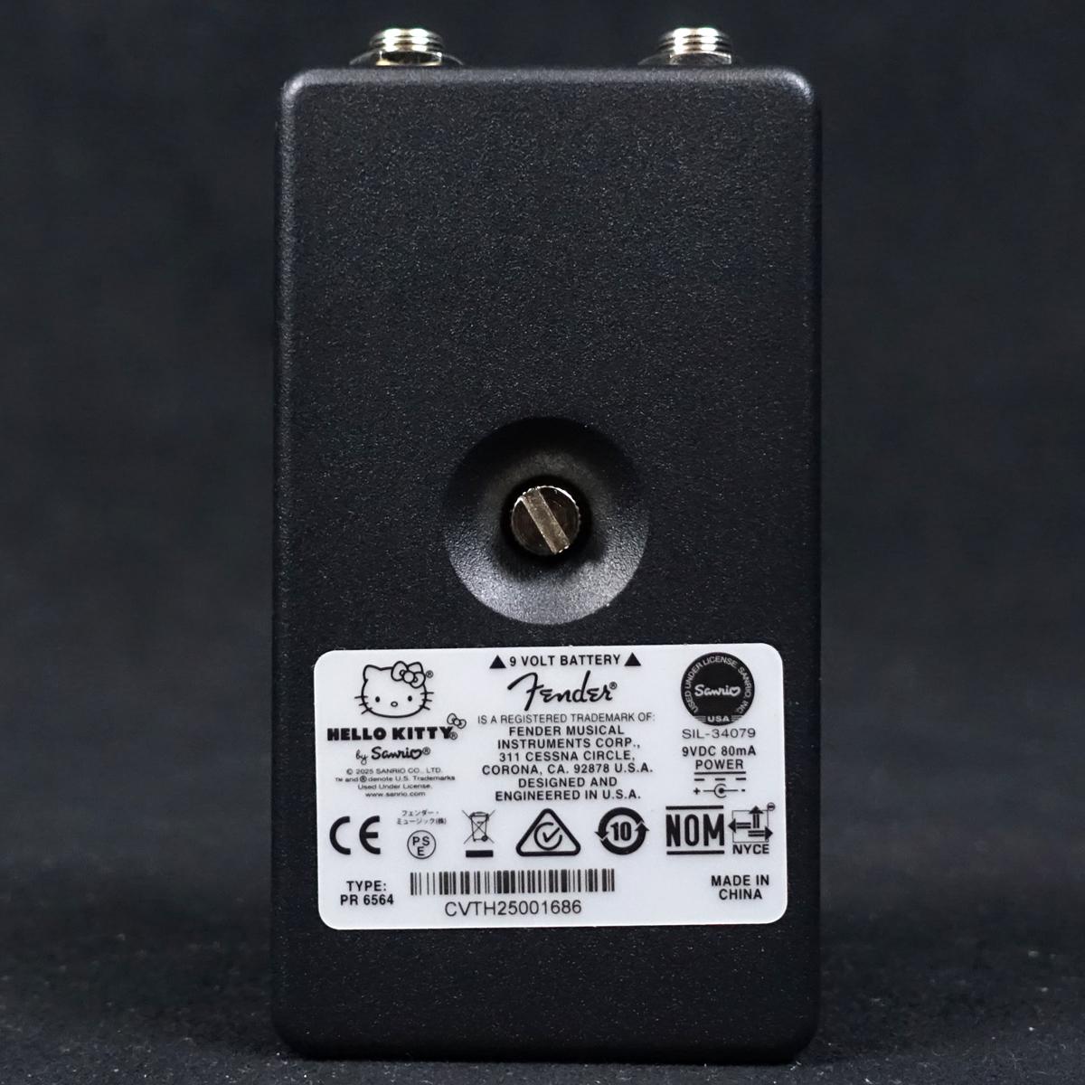 今回登場のFender x Hello Kitty Fuzz Pedal Blackは、新たにブラックフィニッシュを採用し、ウィッチハットノブ、日本語ラベル、そしてもちろんハロー・キティのキャラクターがフロントパネルとサイドにあしらわれているユニークなペダルです。