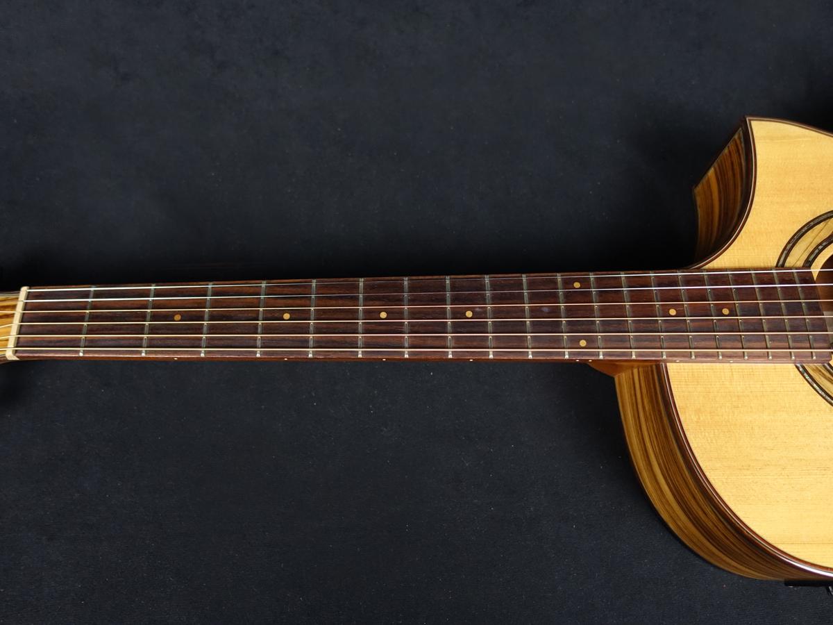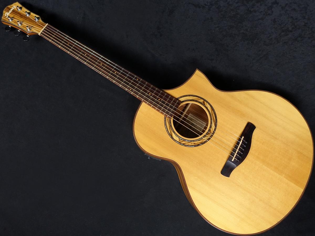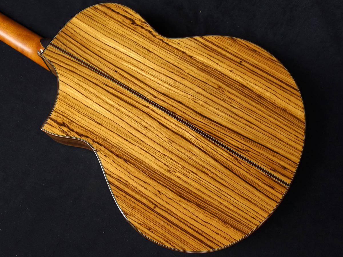 シトカスプルーストップにゼブラウッドサイドバック、マホガニーネック、ローズウッド指板/ブリッジを採用したウッドマテリアル。