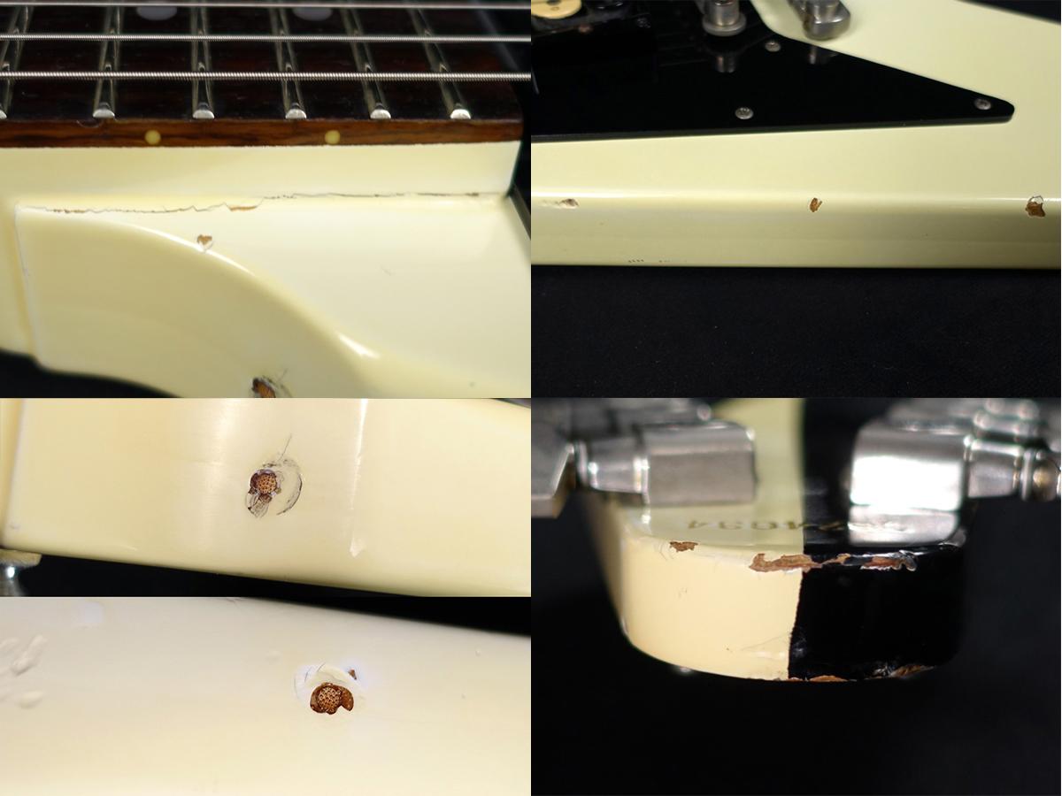 製造から40年以上が経過しているギターということで全体に無数の木部の露出を伴う打痕や弾き傷、金属パーツのくすみ、