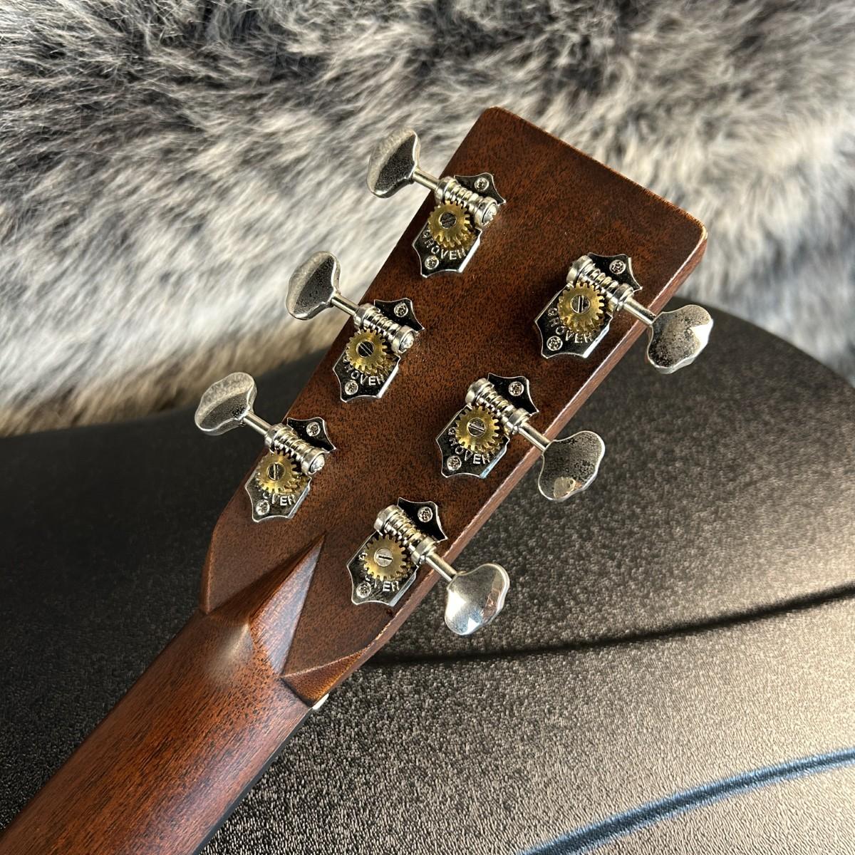 べっ甲柄ピックガード、バタービーンズボタンのオープンギアペグ、オールドスタイルのロゴなどヴィンテージライクなルックスを帯びつつもフォワードシフテッドブレーシングパターンなどモダンな仕様となっています。
