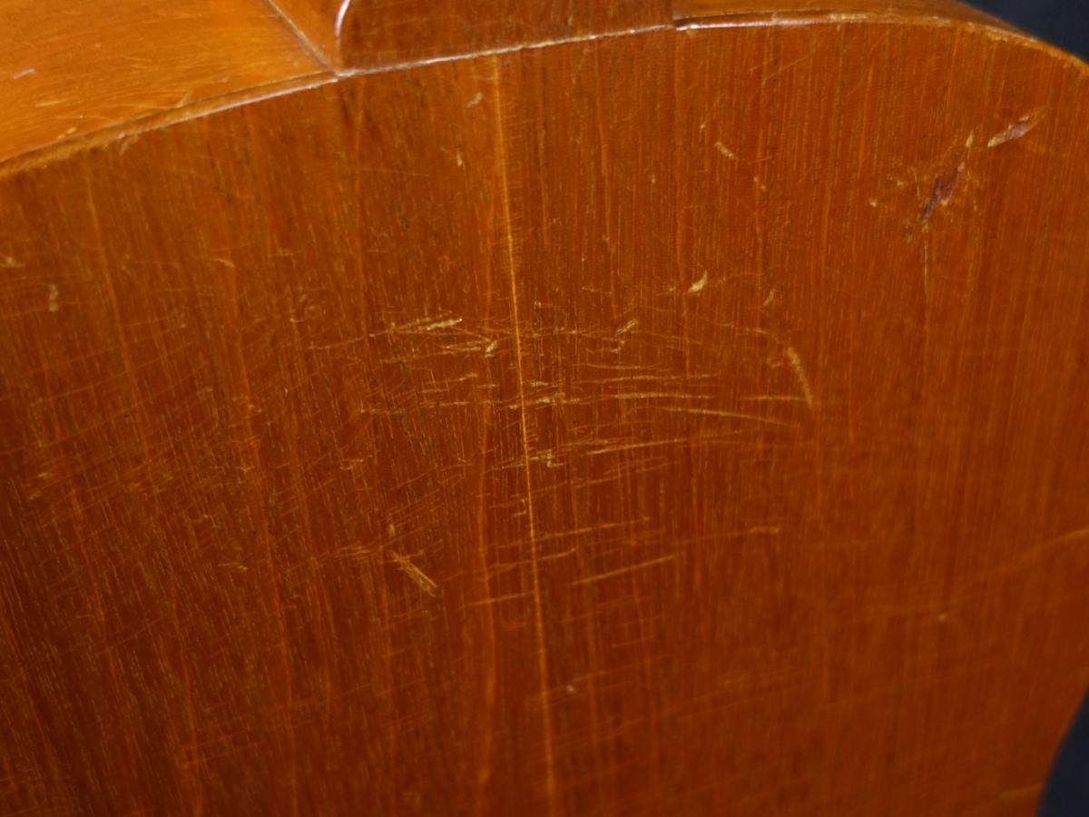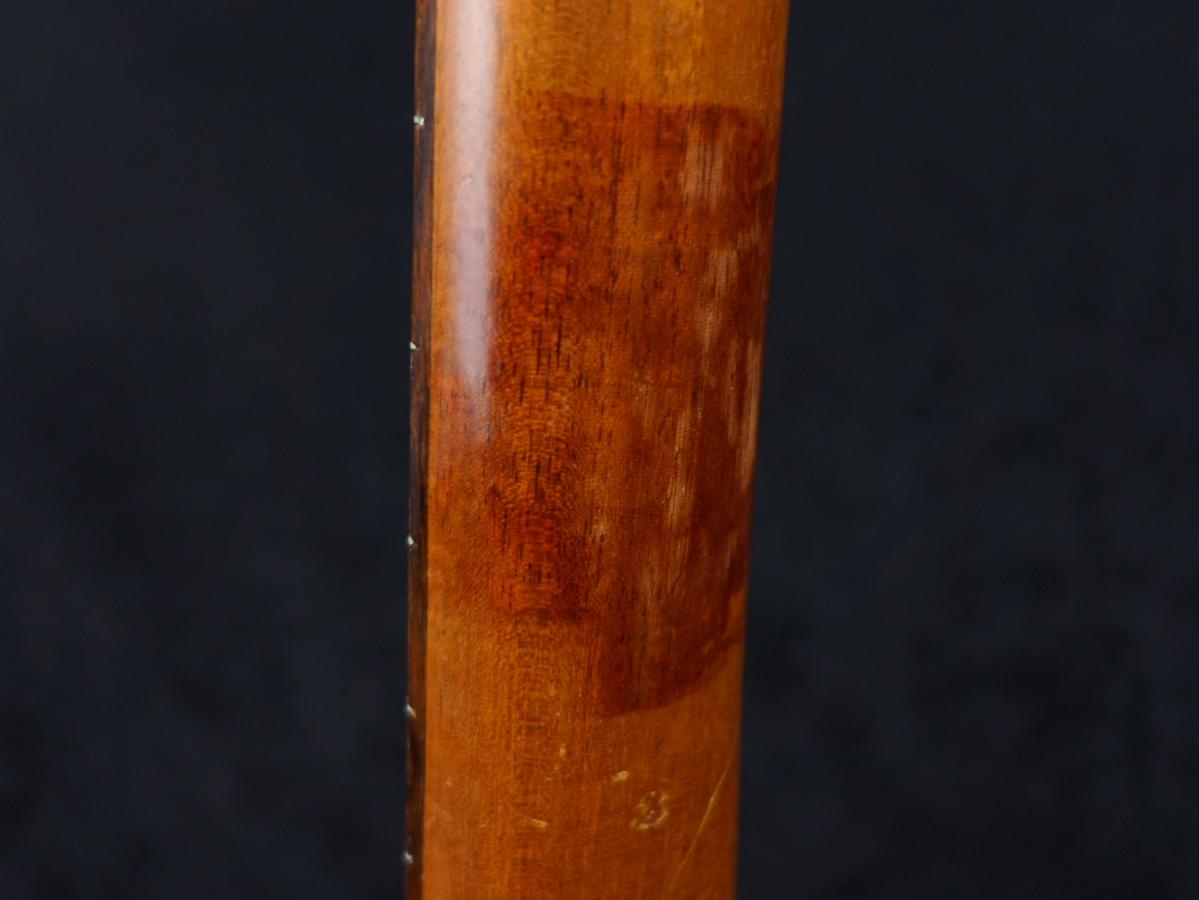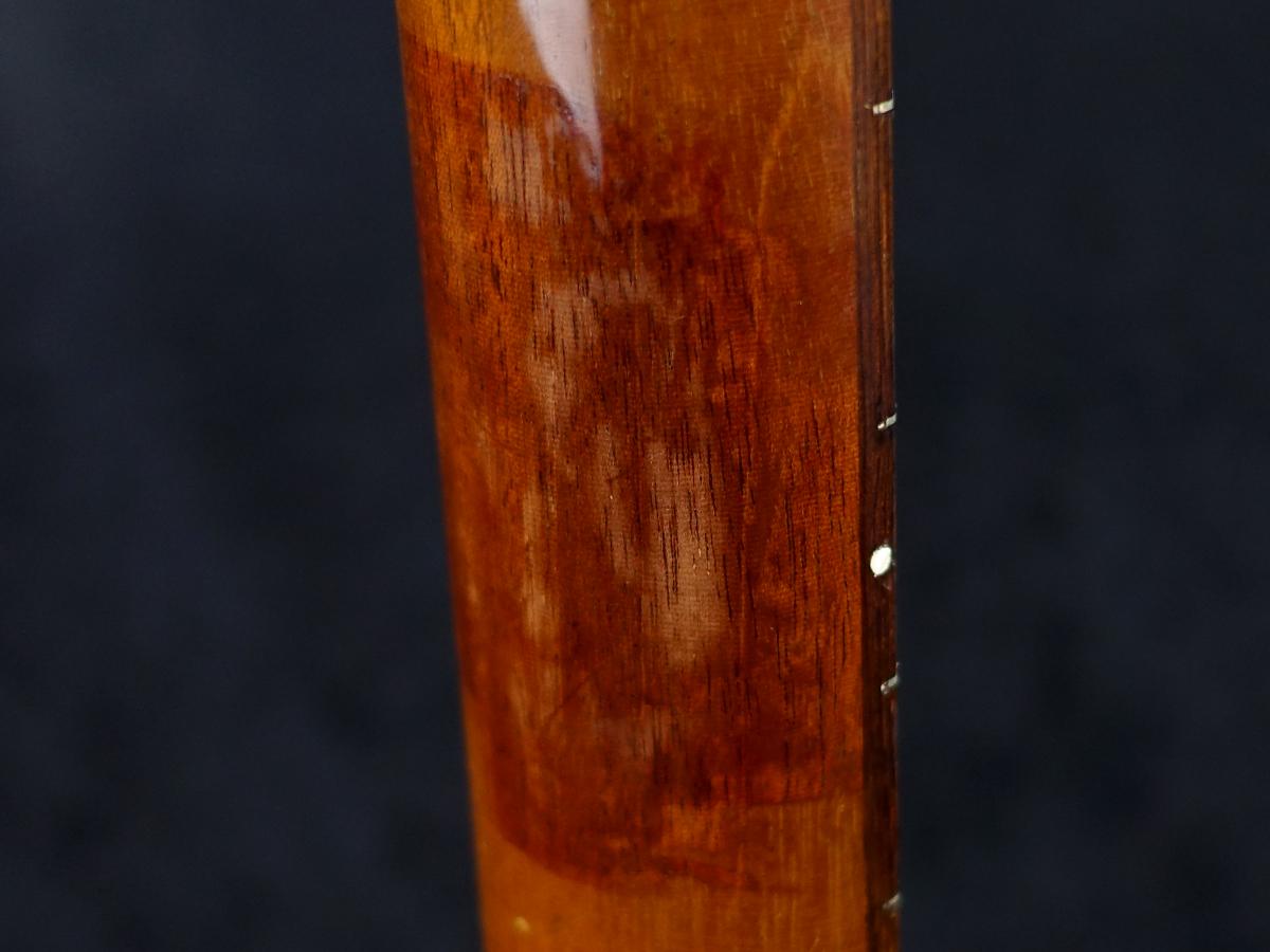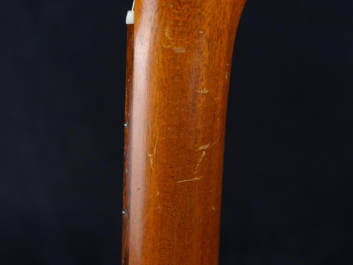 その他にラダーブレイシングでは御愛嬌のトップの膨らみも感じられる他、ネックはやや元起き気味ですが、現状で極端に弦高が高いといった不具合もなく、気になるようなビビりや音詰まりはありません。