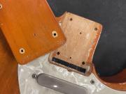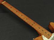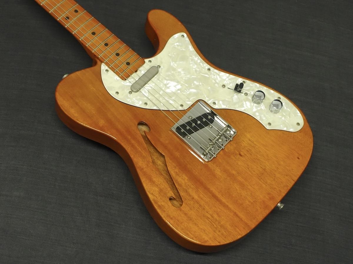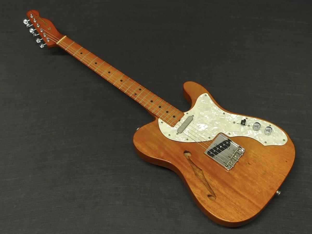 ボディはマホガニー(もしくはマホガニー系)、ネックはメイプルとなりますがシースルーブラウンカラーでオールマホガニー風に仕上げた凝った仕様です。
