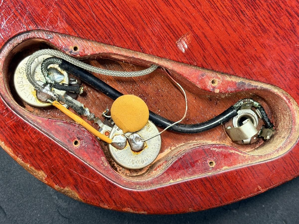 確認できるポットデイトは1964年で、シリアルレンジも1964年に該当。ペグ、コントロールノブ等の主要パーツはオリジナルを保っております。また明確な理由は不明ですが、ピックガードはおそらく上からラッカーが塗布されている状態です。