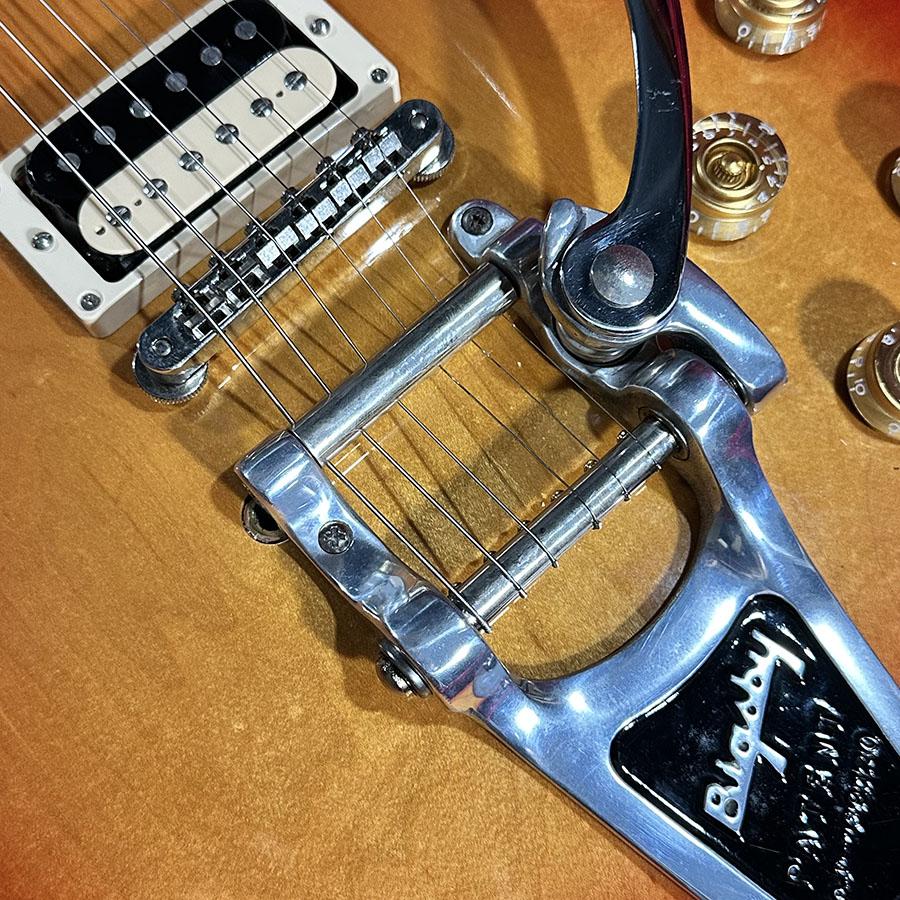 ビグスビーが取り付けられており、それに伴いボディに穴あけ加工が施されています。