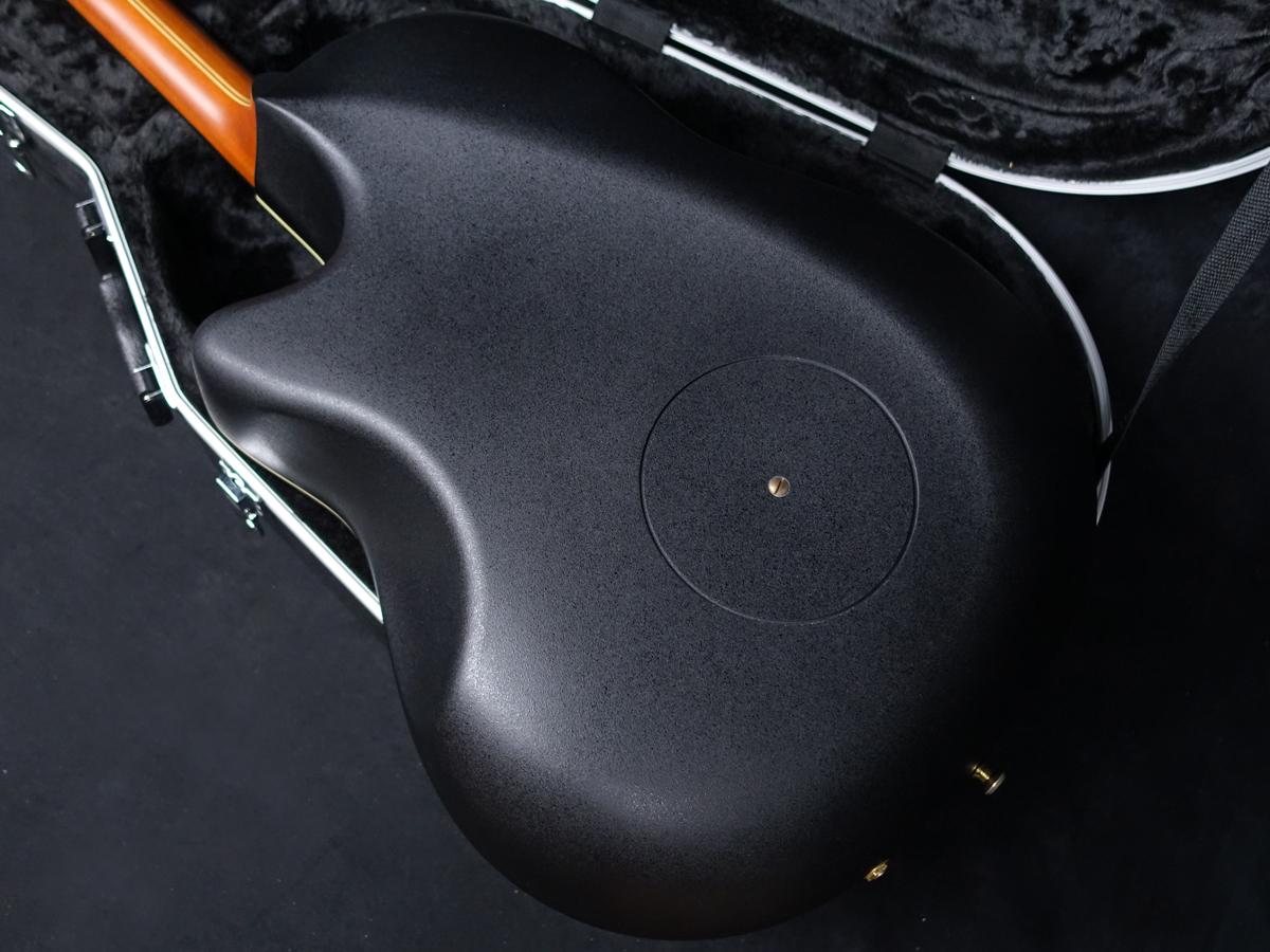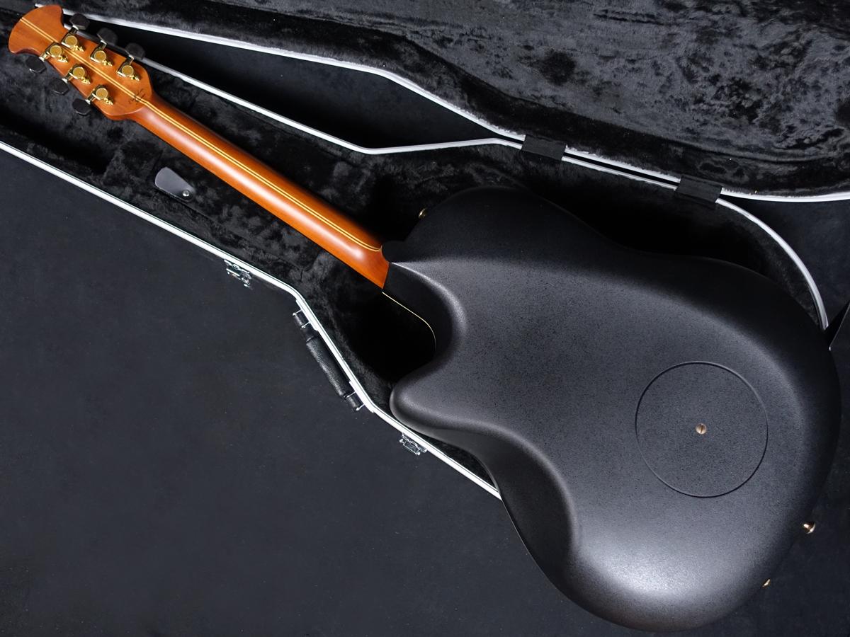 トップ材は美しい杢を持つオクメベニア、サイド/バック材はオベーションの代名詞でもあるリラコードと呼ばれる合成樹脂を採用。