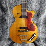 スプルーストップにメイプルサイドバックのボディ、ヘッドにはバーチカルロゴを備え、ピックアップを2基搭載したHofnerのエレクトリック・ギター。
