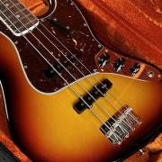 ホワイトネックバインディング、パールドット、マスタートーン付き2ボリュームコントロール、4plyべっ甲柄ピックガードなど、1966 Jazz Bassならではの特徴を備えています。
