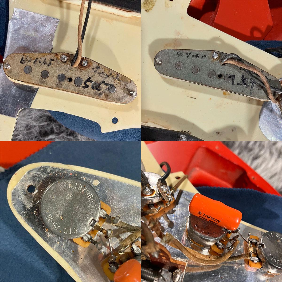 本機は64年デイトのネックやグリーン・ガード、65年シリアルのプレートとピックアップなど年を跨いだような仕様から、1965年製の中でもごく初期に製作された1本かと思われます。