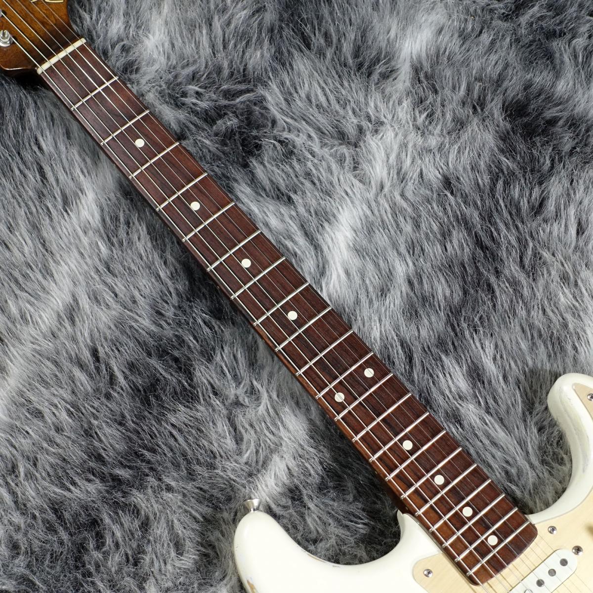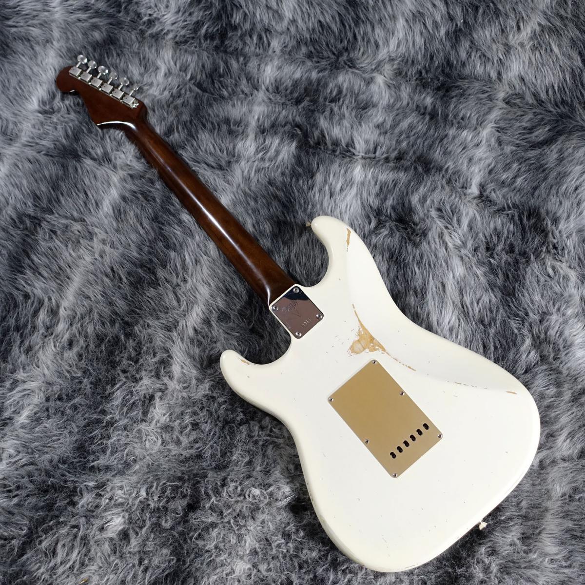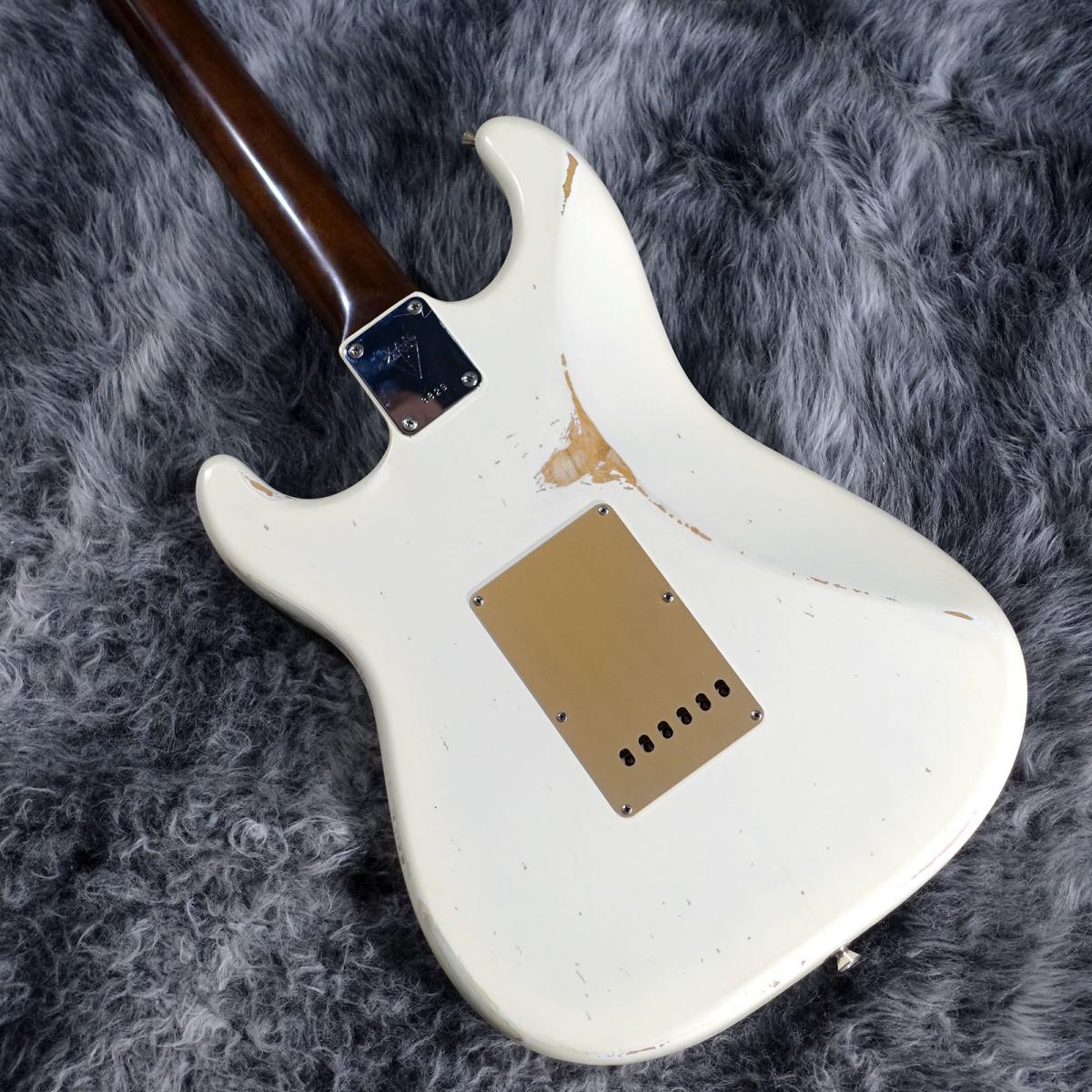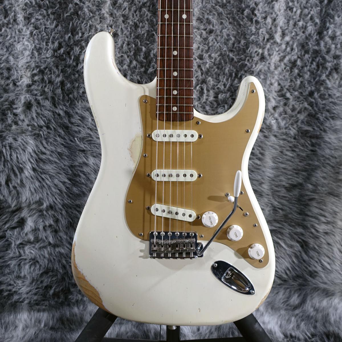 程よいレリック感のホワイトブロンドカラーにゴールドのピックガードが映えるルックス良しの1本。