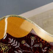 Gibsonの人気機種ハミングバードを基本とし、カスタム生産を象徴するようなアバロン貝によるロゼットとバインディング、手作業でエングレーヴされた象徴的なハチドリや蝶のデザイン、コア材など華麗な装飾が施され、レギュラーモデルとは一線を画す美しいモデルに仕上がっております。