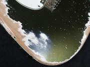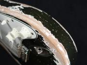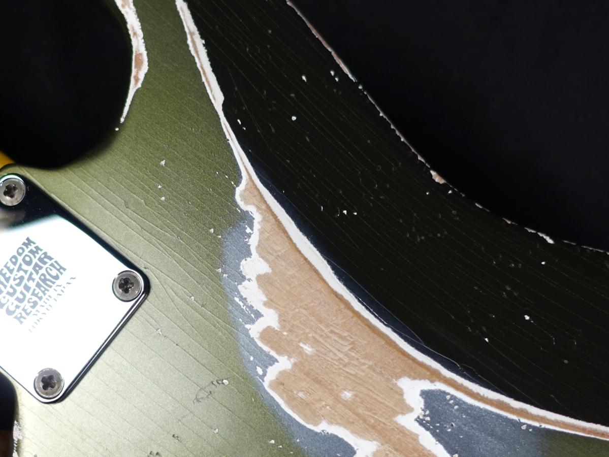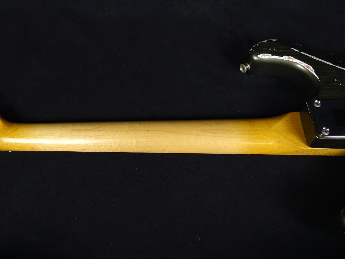全体的にボディには細かくウェザーチェックが入っており、フィニッシュもかなりハードなレリックが施されております、ネック裏は木部は露出しておらずクリアフィニッシュになっております。