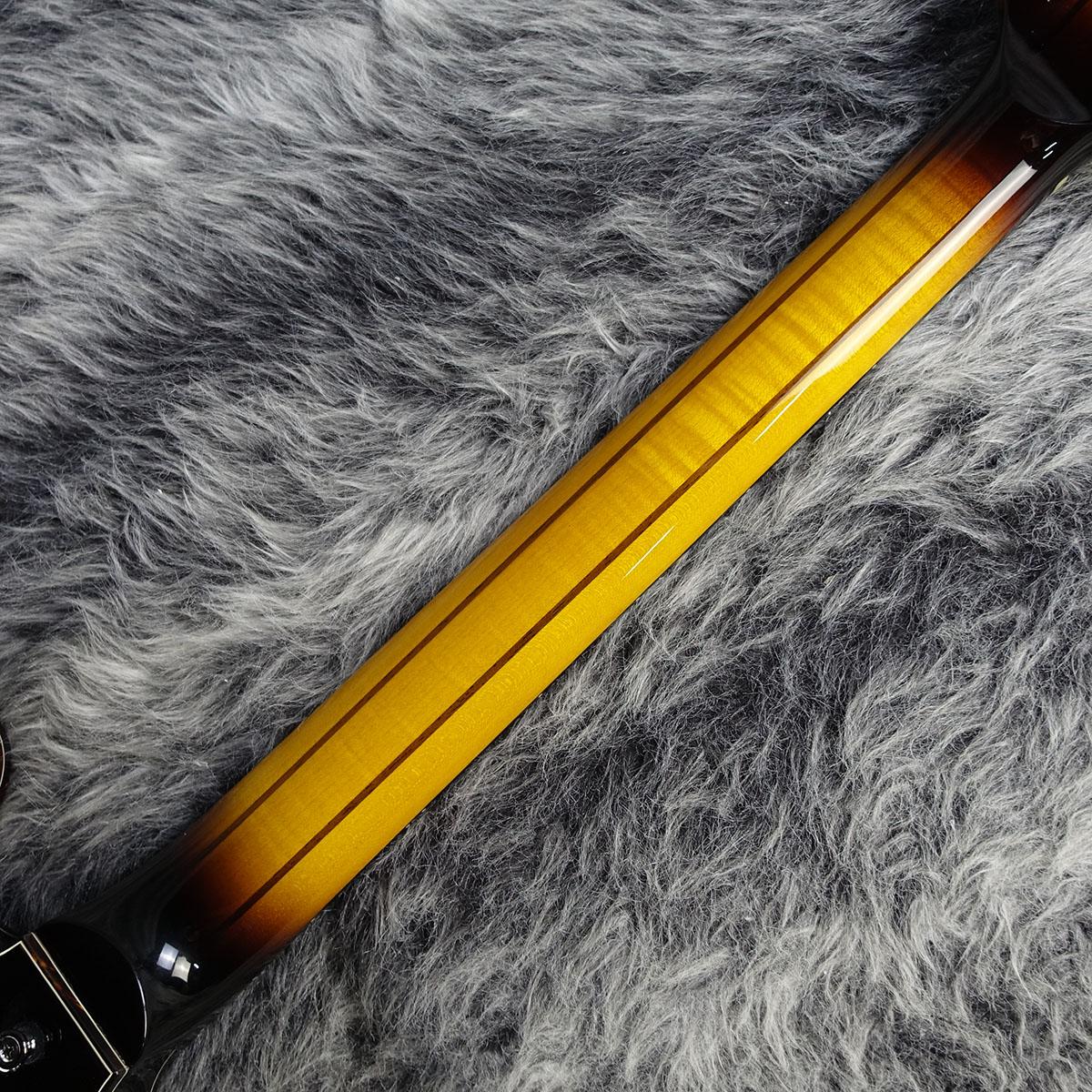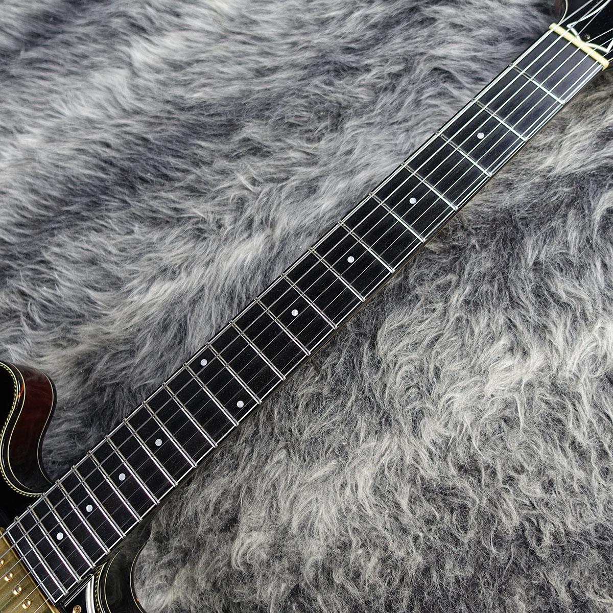フレイムメイプルやヘリンボーンタイプのボディバインディング、特徴的なトラピーズタイプのテールピースなど上品なルックスが目を惹く一本です。