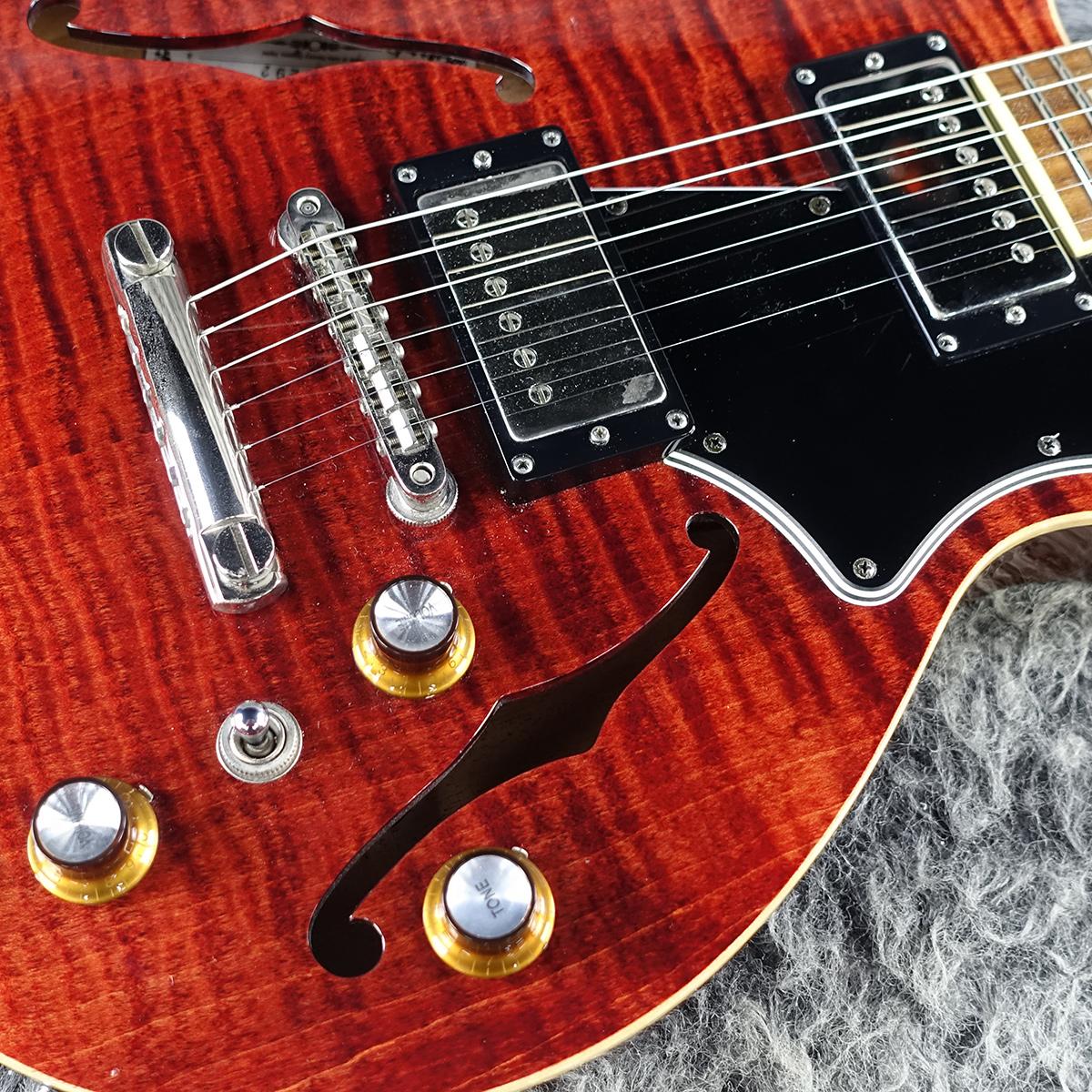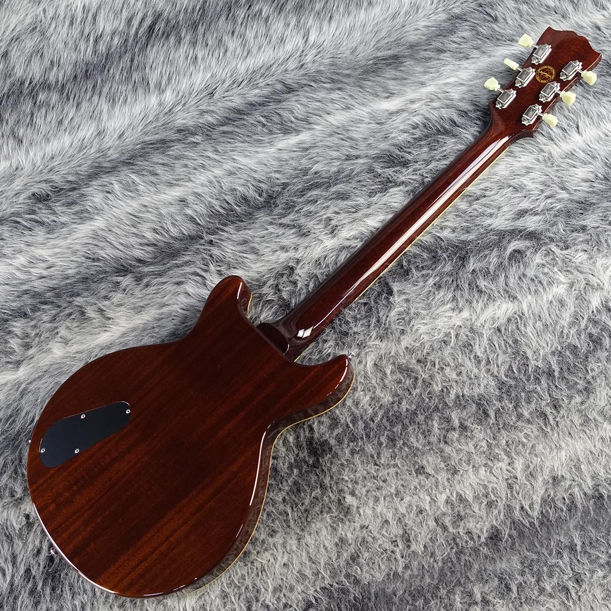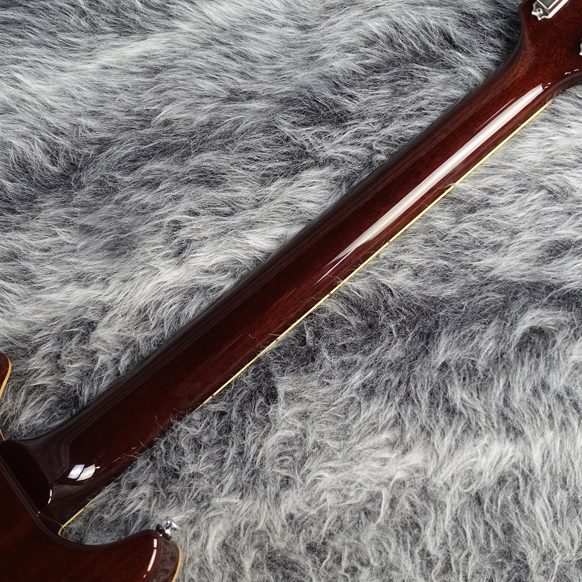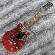 ダブルカッタウェイ仕様のレスポールスぺシャルを彷彿させるデザインながらマホガニーボディは一度くり貫かれた後、センターブロックを配置したセミアコ構造。