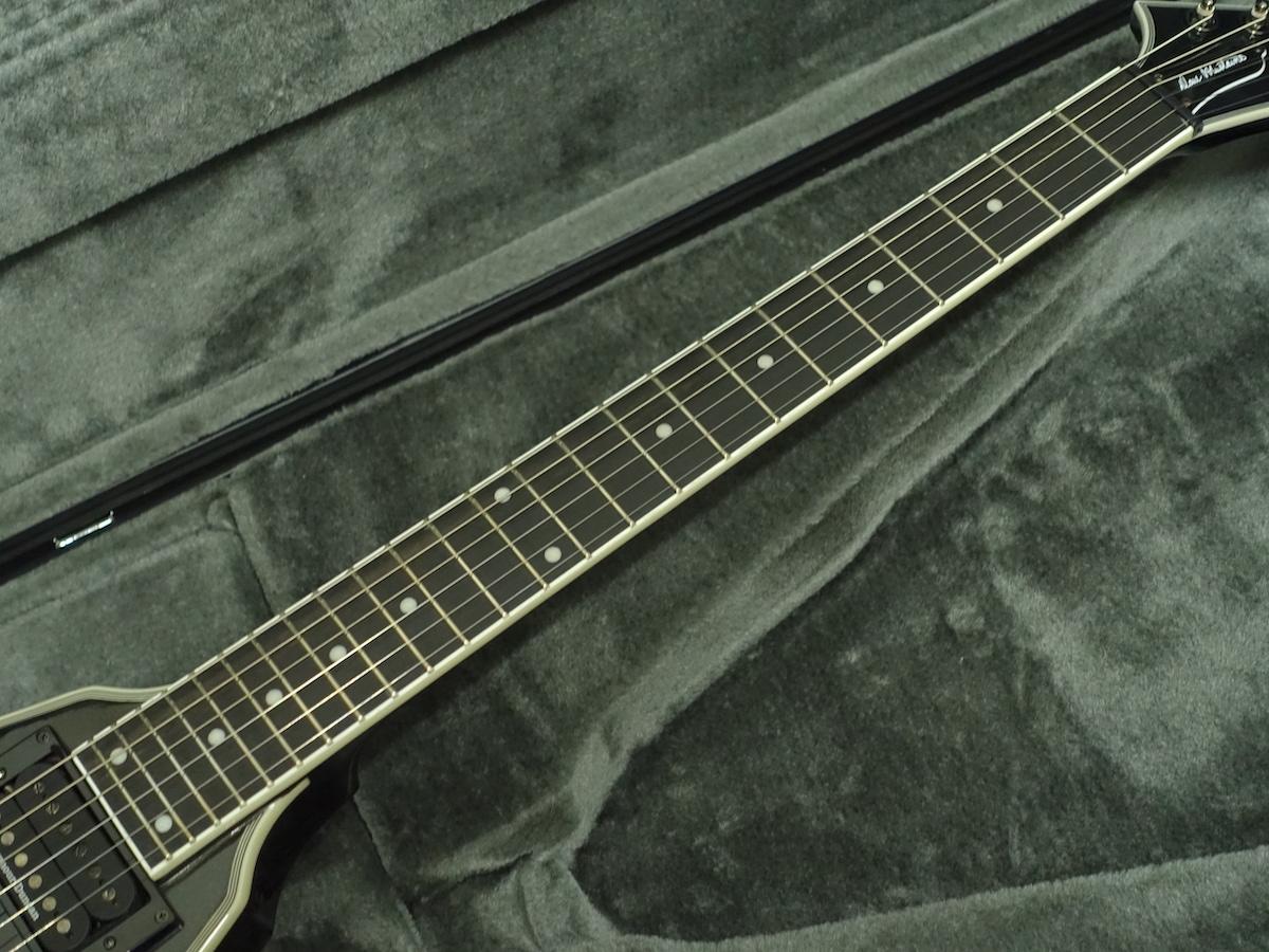 24.75インチスケールのマホガニーネックは24フレット仕様であり、ミディアムジャンボフレット、エボニー指板、Explorerスタイルのヘッドストック形状、Groverミニロトマチックチューナー、Graph Techナットが採用されています。マホガニー材によるFlying Vスタイルのボディには、Lock Tone Tune-O-Maticブリッジ、裏通しタイプのFlying Vテールピース、Daveのシグネチャー・ピックアップであるSeymour Duncan Thrash Factorピックアップが搭載されており、ムステインのシグネチャー・モデルに相応しい高出力なギターサウンドを提供します。ヘビーメタルを想起させるルックスには、精悍な印象を与えるブラックメタリック・フィニッシュとギター全体に施されたホワイトバインディングの絶妙なコントラストが一役買っています。ブラックニッケル・ハードウェア仕様で、ハードシェルケースが付属となります。