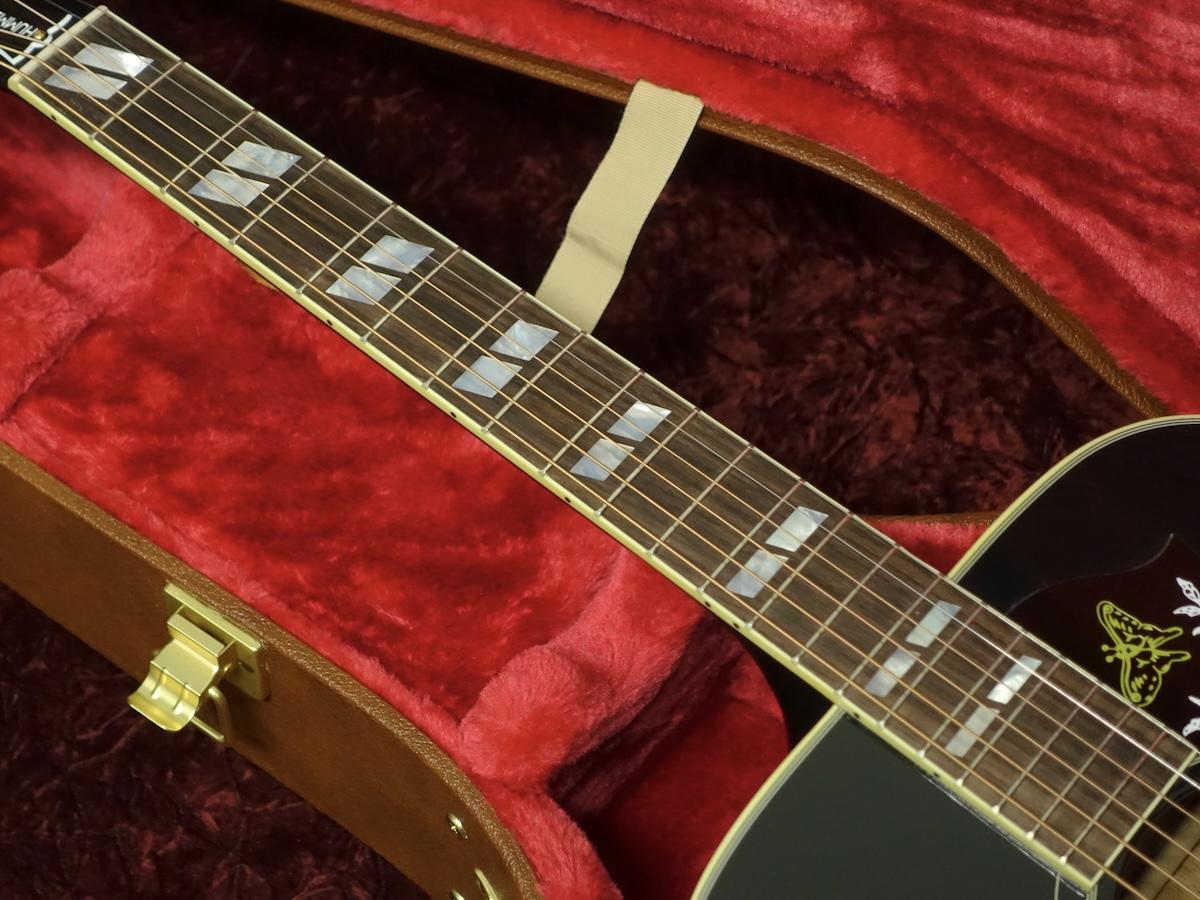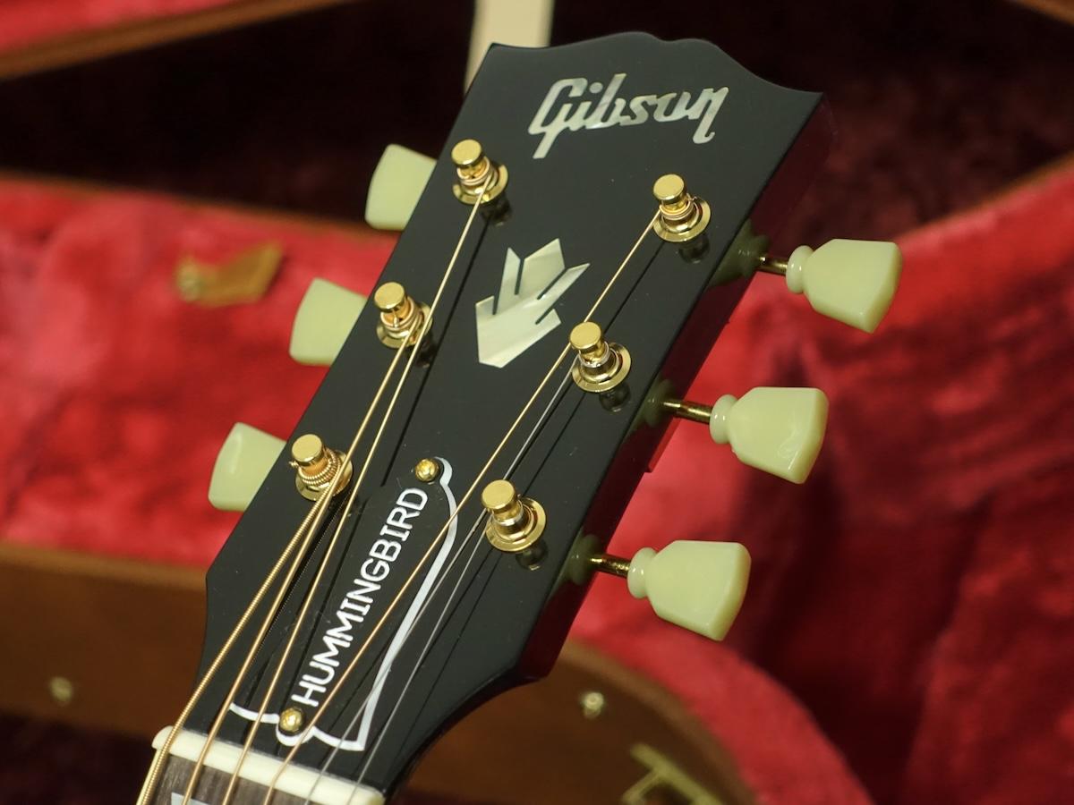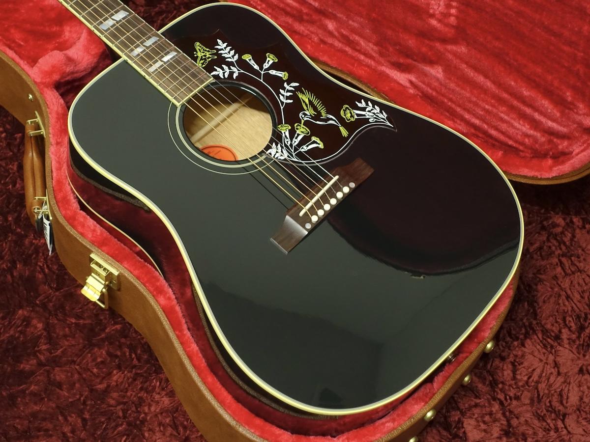 トップ材にスプルース、サイドバックにマホガニーを使用したオール単板のスクエアショルダーボディにハチドリの描かれたピックガードを施した定番スペックのハミングバード。