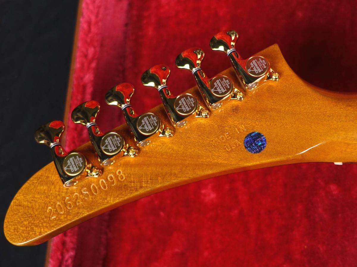 バインディングのないローズウッド指板、ゴールドのスピードノブ、ゴールドハードウェア、パーチメントカラーのピックガード、ペグにはGOTOH製のデルタシリーズのゴールドペグが採用されております。