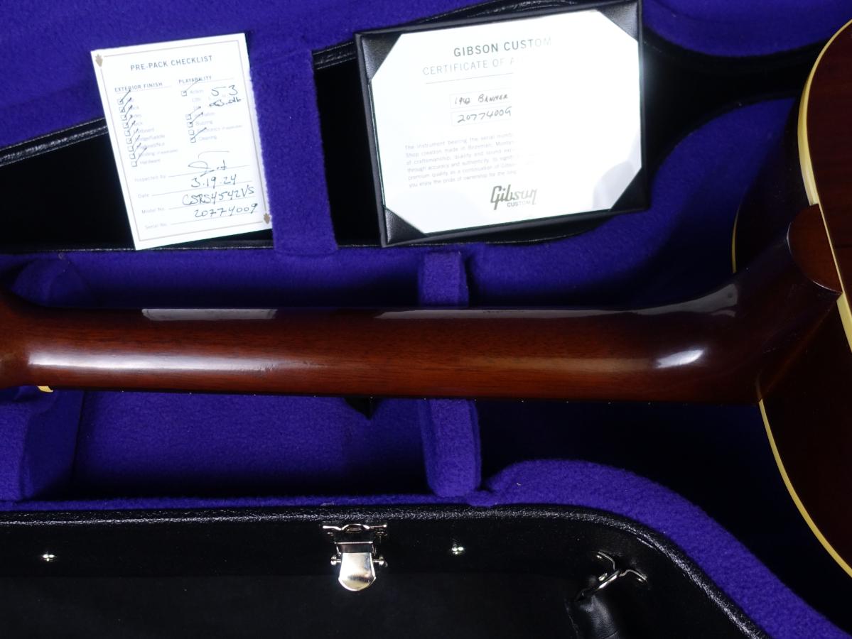 新製品の1942 Banner J-45は、ヒストリック・スタイル・バースト色でハンドスプレーされたサーマリー・エイジド・アディロンダック・レッド・スプルース・トップ。