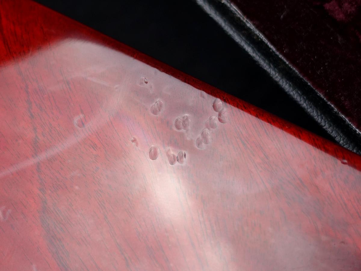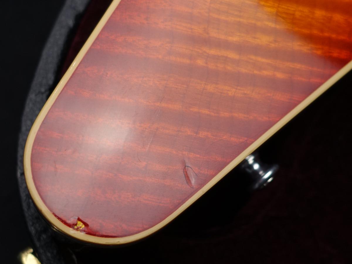 特に目立った箇所ではボディバックに3mm程度の打痕が広範囲に見受けられる他、ヘッドサイドと天板との間の塗装が割れ、剥がれが見受けれられます。