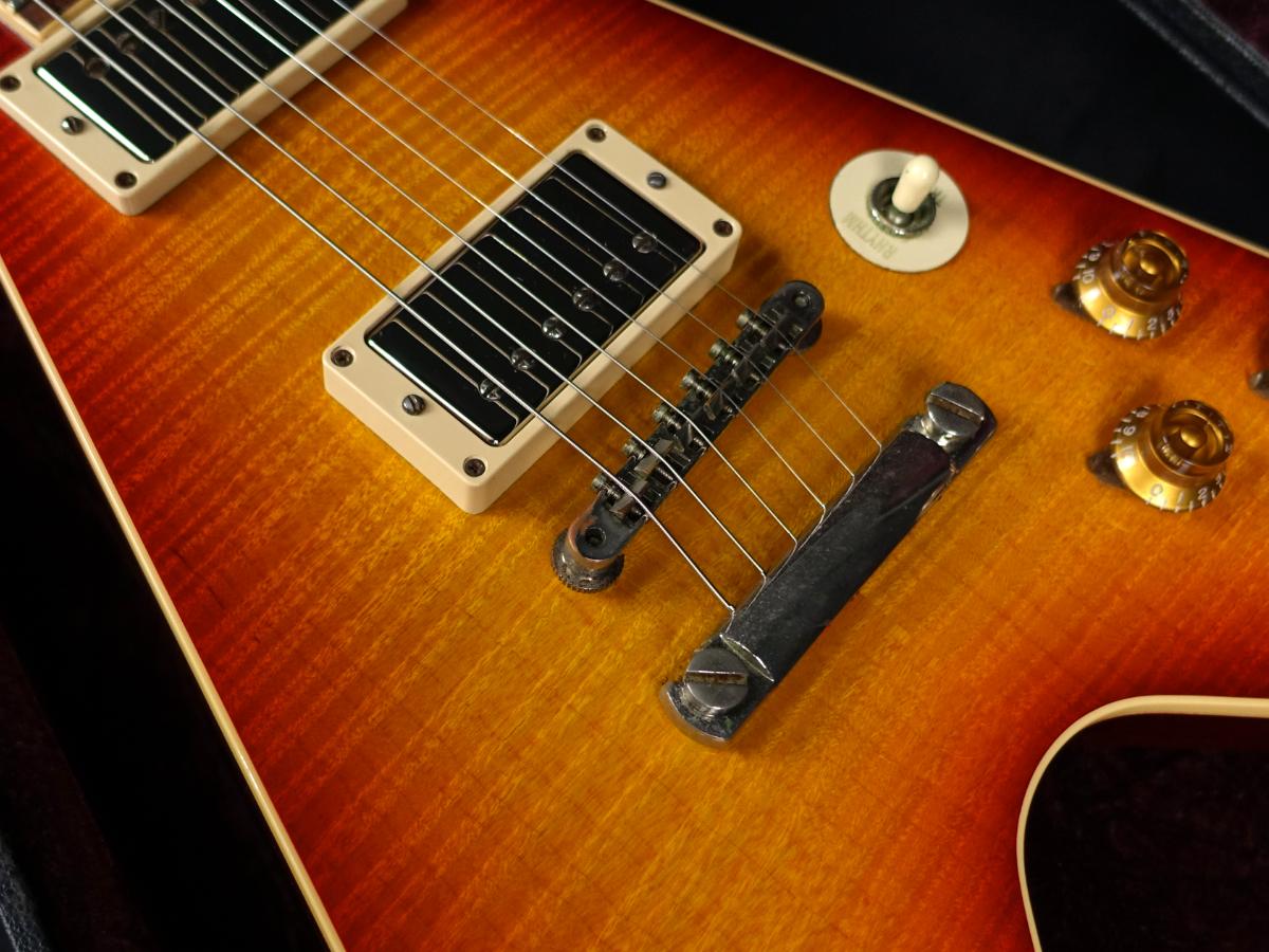 市場ではなかなか見ることのないFlying V Standard、フレイムメイプルにチェリーサンバーストフィニッシュの組み合わせも相まってヴィンテージライクな雰囲気もありつつ、細部に至るまでこだわりが感じられる一本となっております。