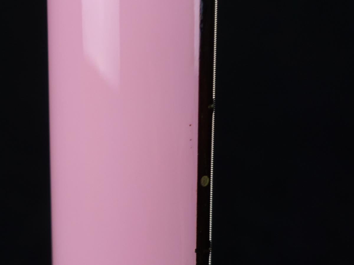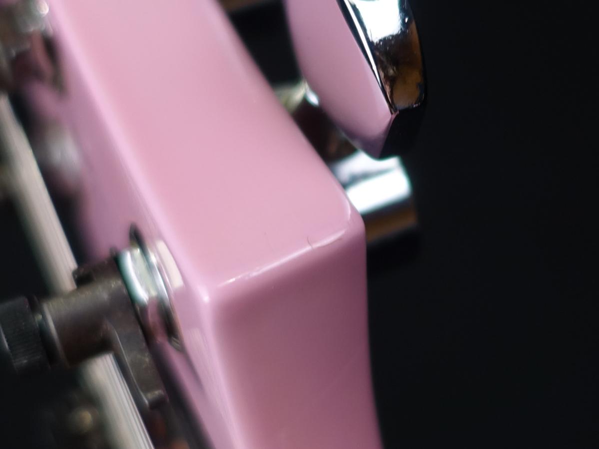 本機はトップはボニーピンクカラーにバック面にはミルクピンク、ボディトップは最高級グレードのキルトメイプル、指板は黒々としたブラジリアンローズウッド(ハカランダ)を採用しております。