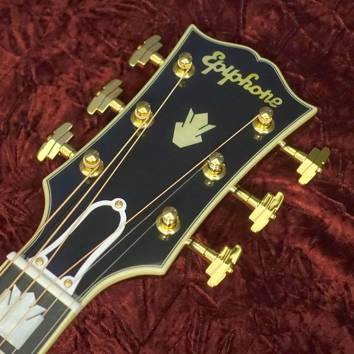 オープンブック型のヘッドストックには、エイジングの施されたマザー・オブ・パールを用いたヴィンテージ・スタイルのEpiphoneロゴとギブソン・クラウン・インレイが埋め込まれています。