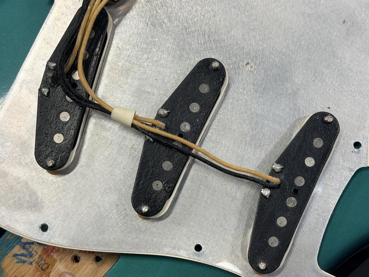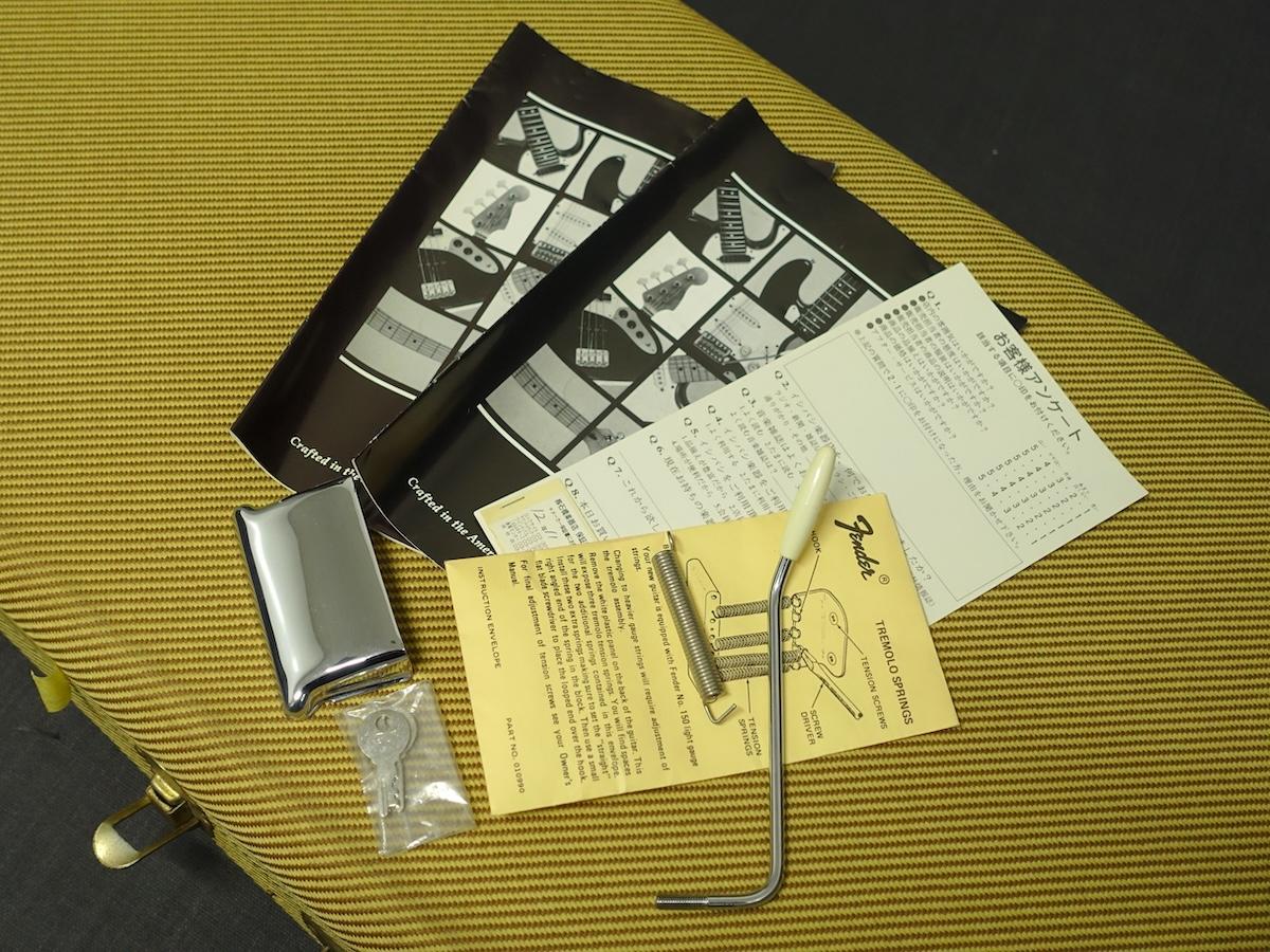 アルダーボディにメイプルネック、 スラブ・ローズウッドフィンガーボードをセットしたウッドマテリアル。ポットやコンデンサー、ピックアップなどは交換された形跡が無く、確認できるポットデイトは95年でネック&ネックポケットデイトは96年となっております。セレクタースイッチも3wayが搭載されています。