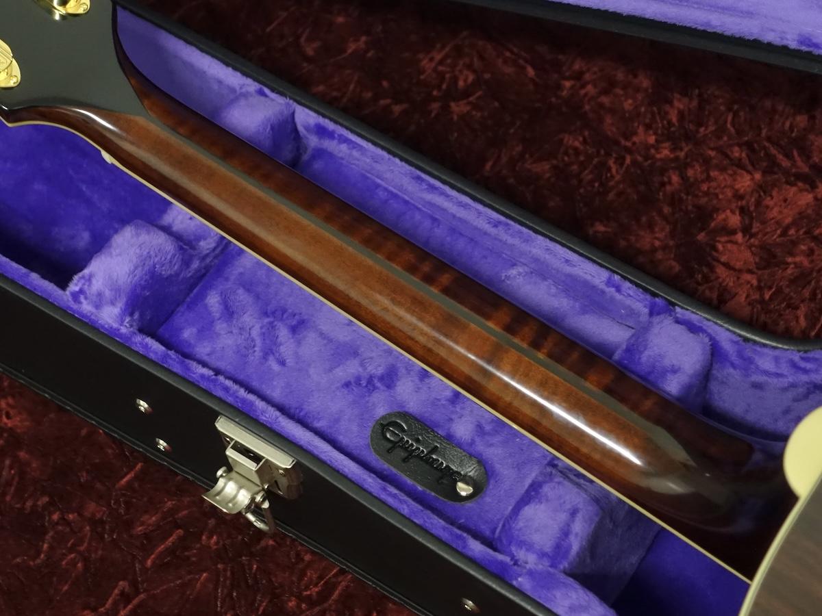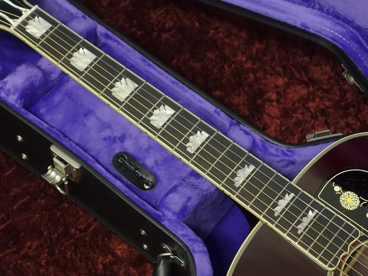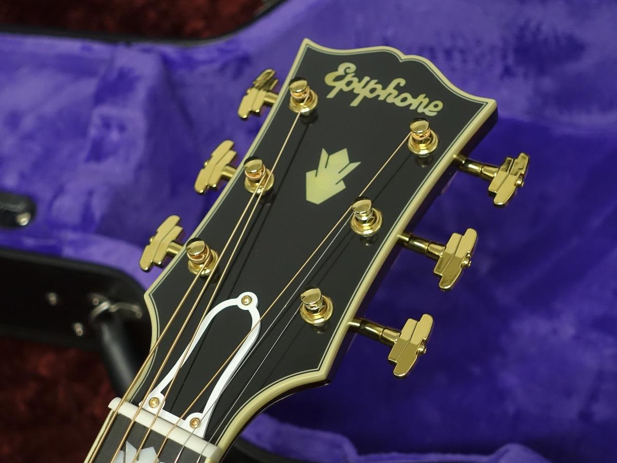 オープンブック型のヘッドストックには、エイジングの施されたマザー・オブ・パールを用いたヴィンテージ・スタイルのEpiphoneロゴとギブソン・クラウン・インレイが埋め込まれています。