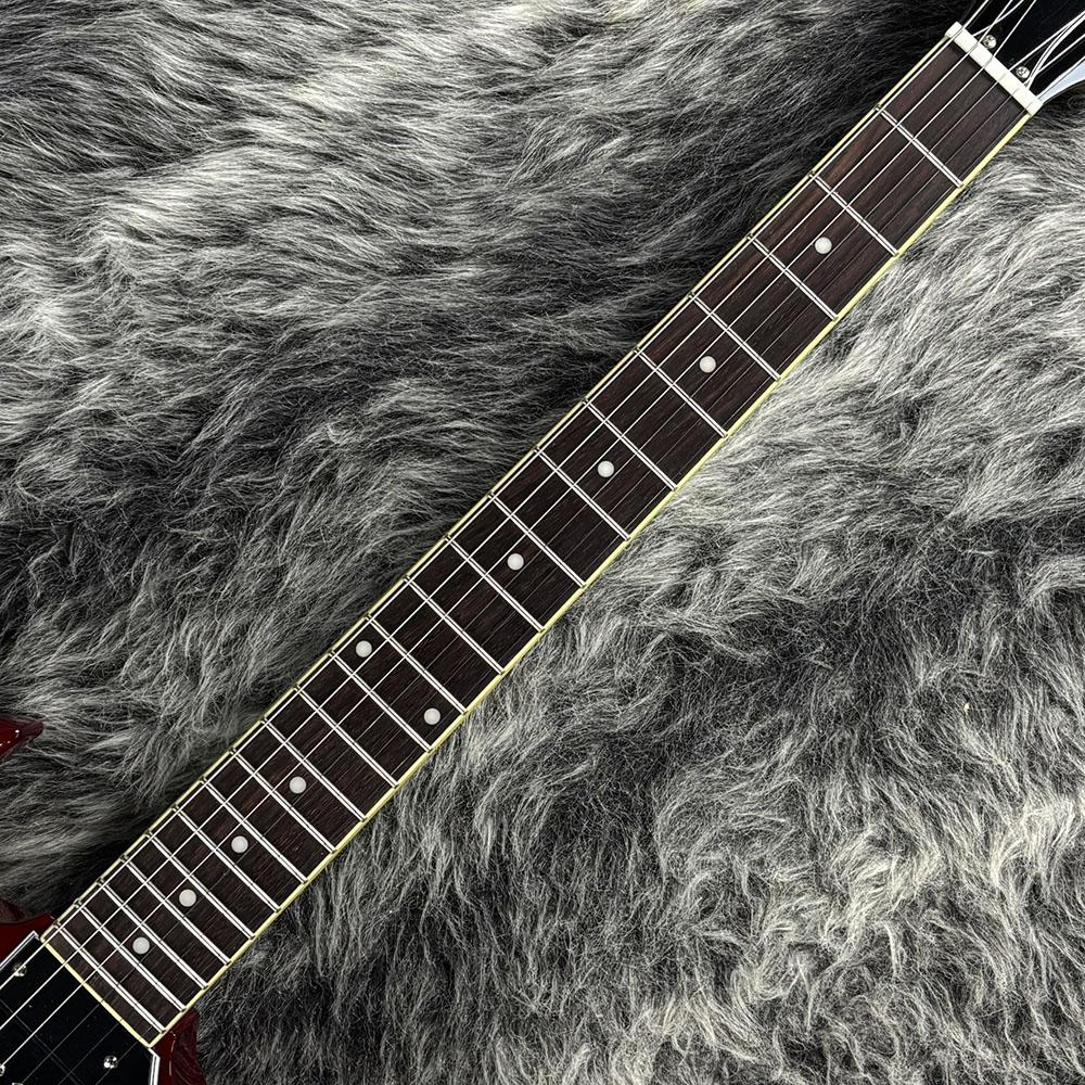 指板にはバインディング付きローズウッドを使用し、22本のミディアム・ジャンボフレットとパーロイド・ドットポジション・マーカーインレイを装備しています。