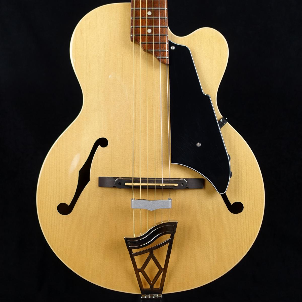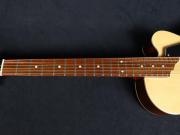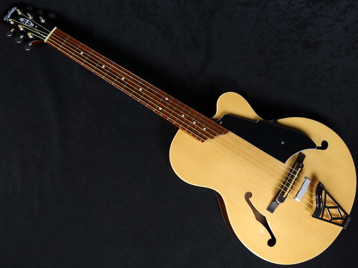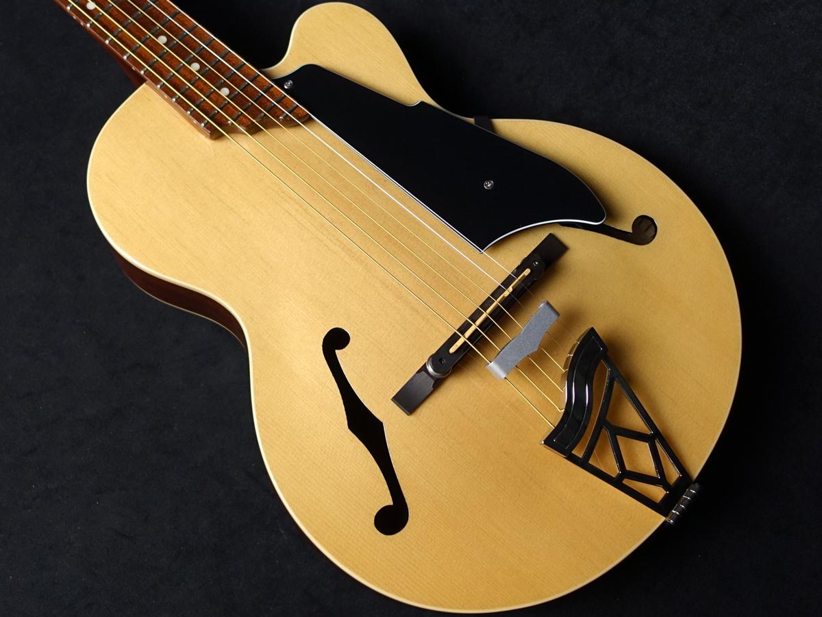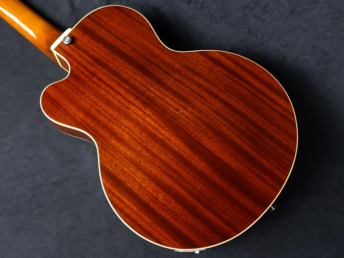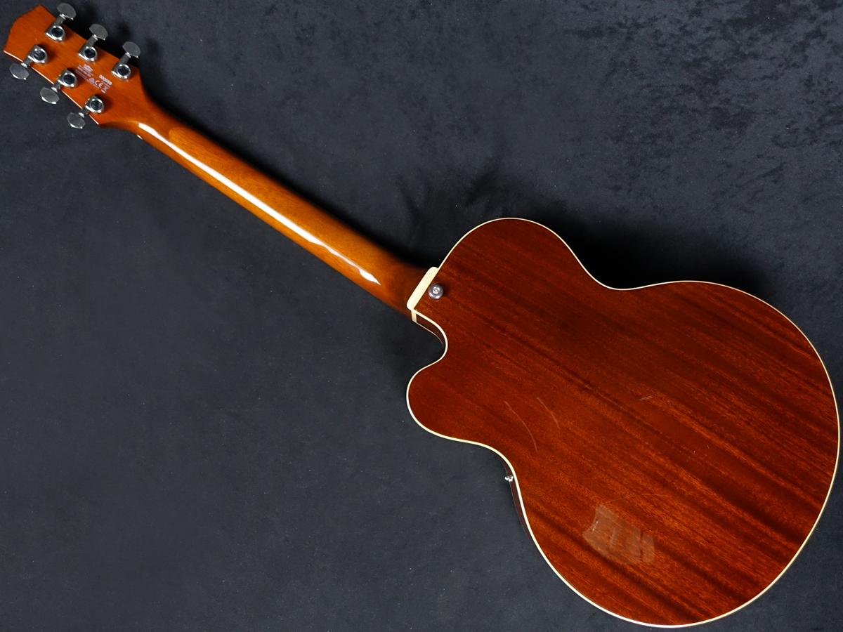 伝統的なアーチトップ構造のボディはラミネイトスプルーストップにラミネイトマホガニーサイド/バックを採用。その他ウッドマテリアルはマホガニーネックにベイクドジャドバ指板を採用しております。