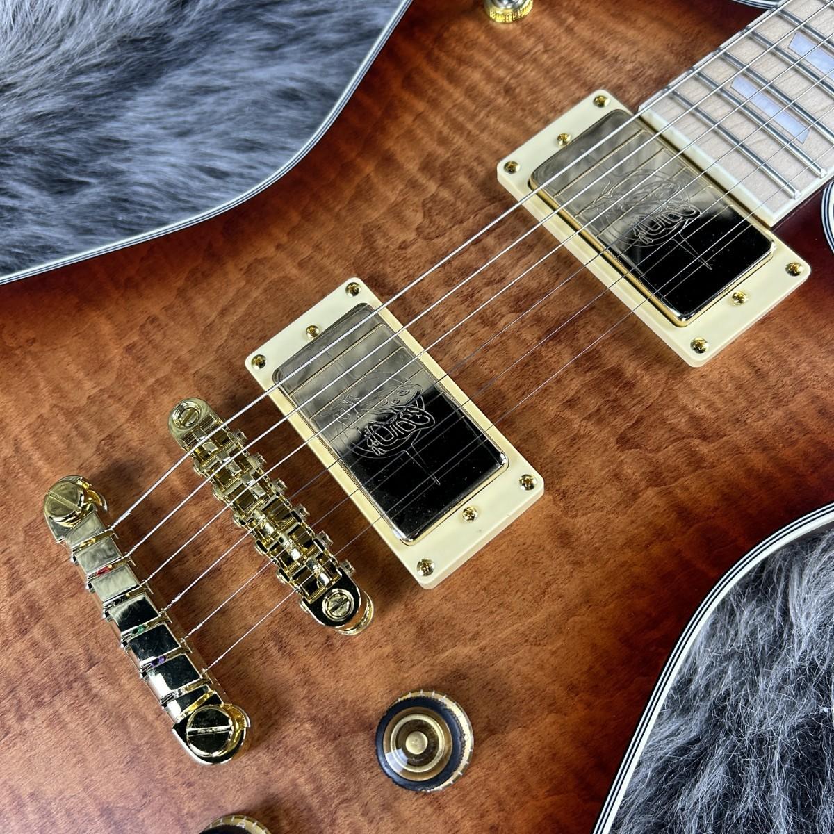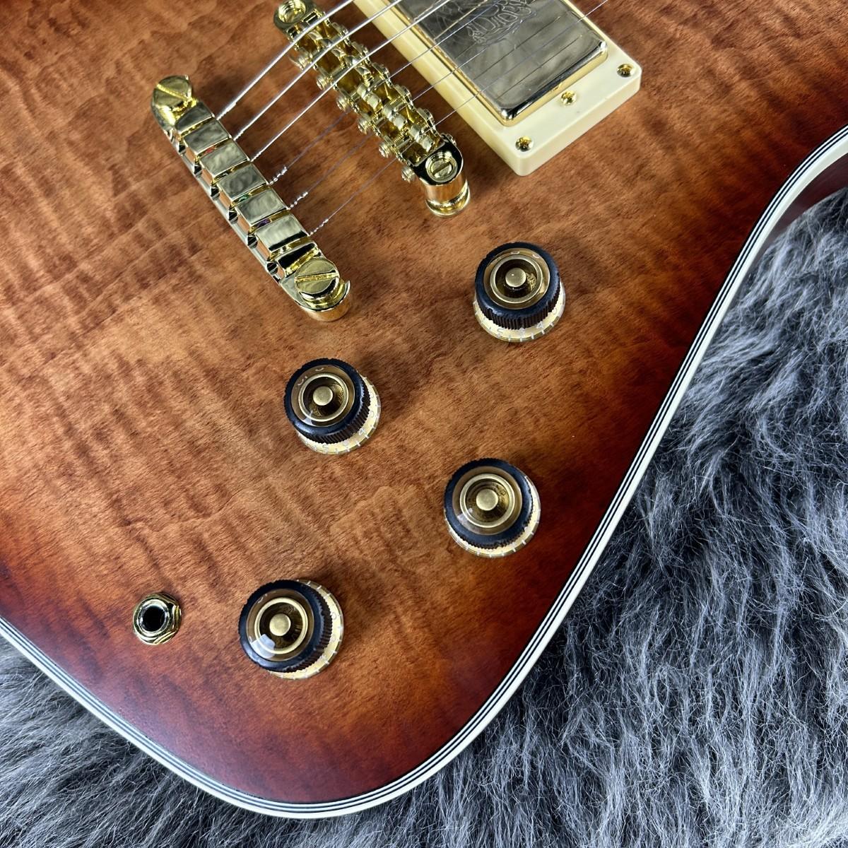 フレイムメイプルトップとオクメ材ボディ/ネックの組み合わせ。