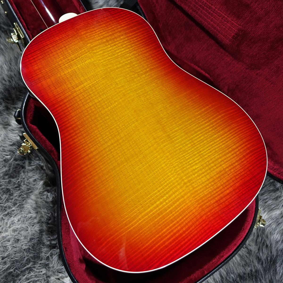 スプルーストップに美しい杢目のフレイムメイプルをサイドバックに使用したラウンドショルダーボディにマホガニーネック&ローズウッド指板のウッドマテリアル。