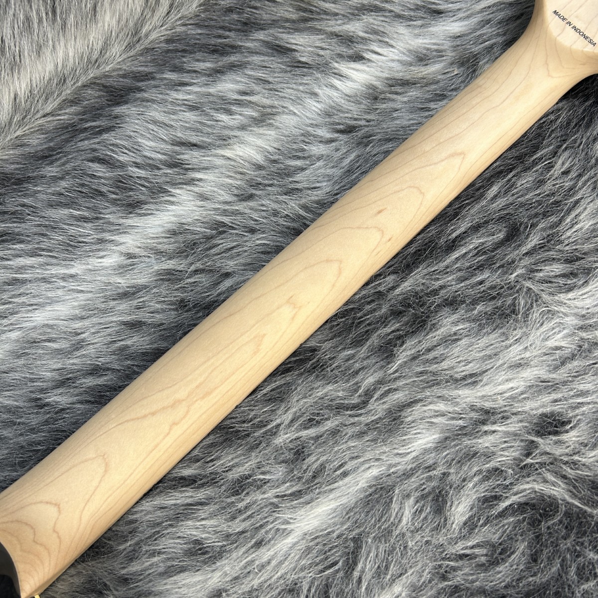 オリジナルのバスウッドボディに華やかなキルトメイプルをラミネートした華やかなルックス。