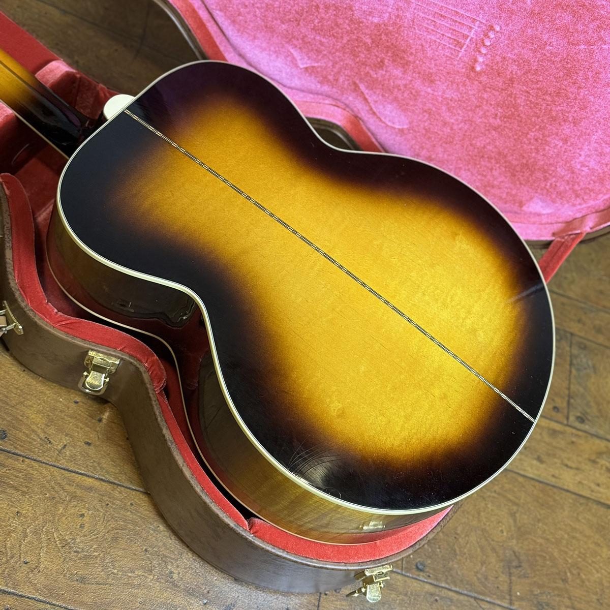 とりわけSJ-200には華やかなフレイム・メイプルがサイド、バック材として使用される印象がありますが、当器はそれほど華美でなく、お淑やかでありながらもダイナミックで存在感のある杢のフレイム・メイプル材が使用されており、これは1957年当時のSJ-200も概ね似たような外観の個体がよく見られることに所以していると思われ、ギブソン・カスタムショップの徹底したギター作りに対する姿勢が垣間見える意匠であると感じます。
