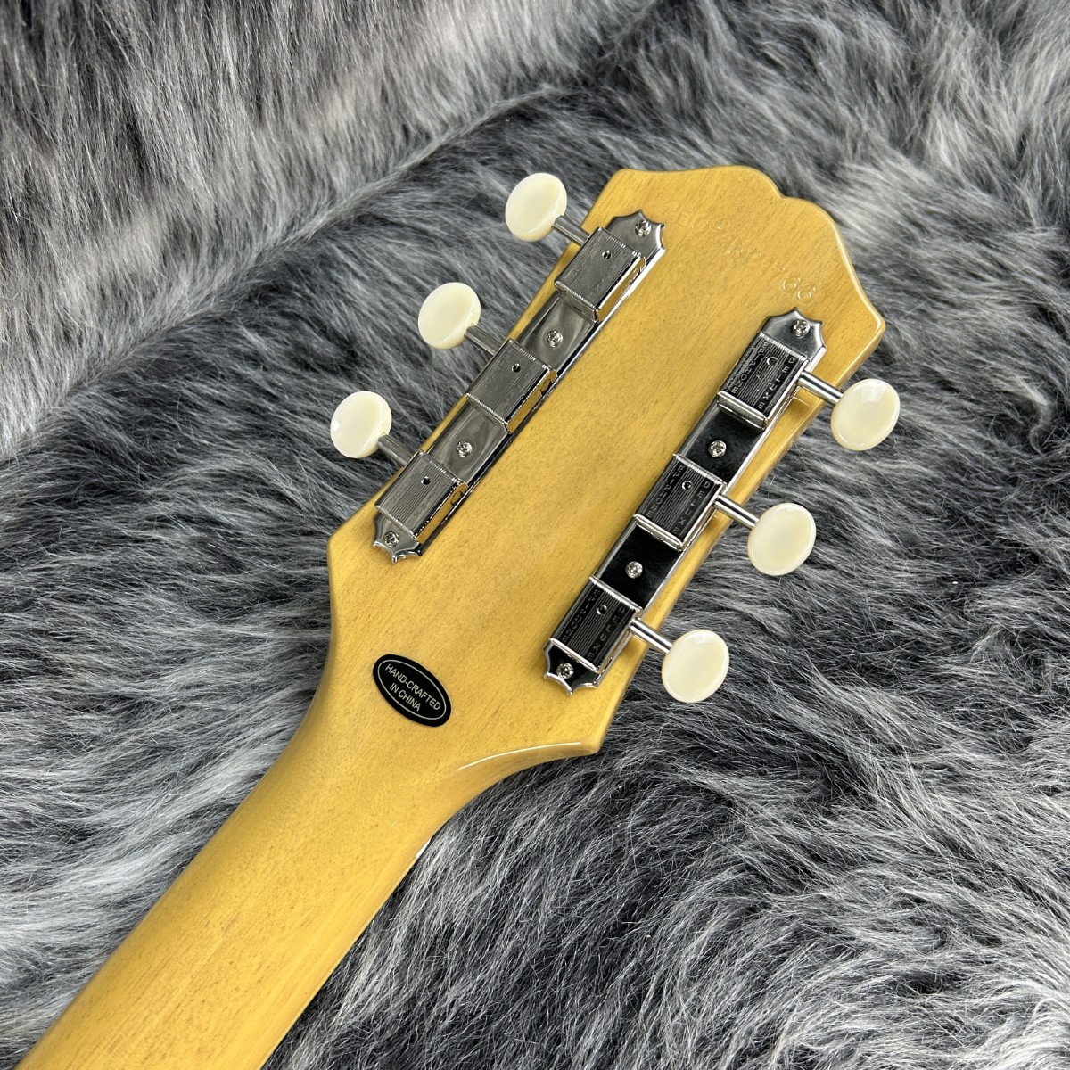 セットネック構造のマホガニー・ネックには60sスリムテーパー・プロファイルを採用し、バインディング付きローズウッド指板には22本のミディアム・ジャンボ・フレットとパーロイド・ドット・ポジション・マーカー・インレイを備えています。1960年代スタイルのカラマズー・ヘッドストックには、アイボリー・ボタンを備えたエピフォン3連ペグとGraph Techナットを搭載し、安定したチューニング性能と確かなヴィンテージ感を実現しています。ヘッドストックには、マザー・オブ・パールのエピフォン・ロゴがインレイされています。