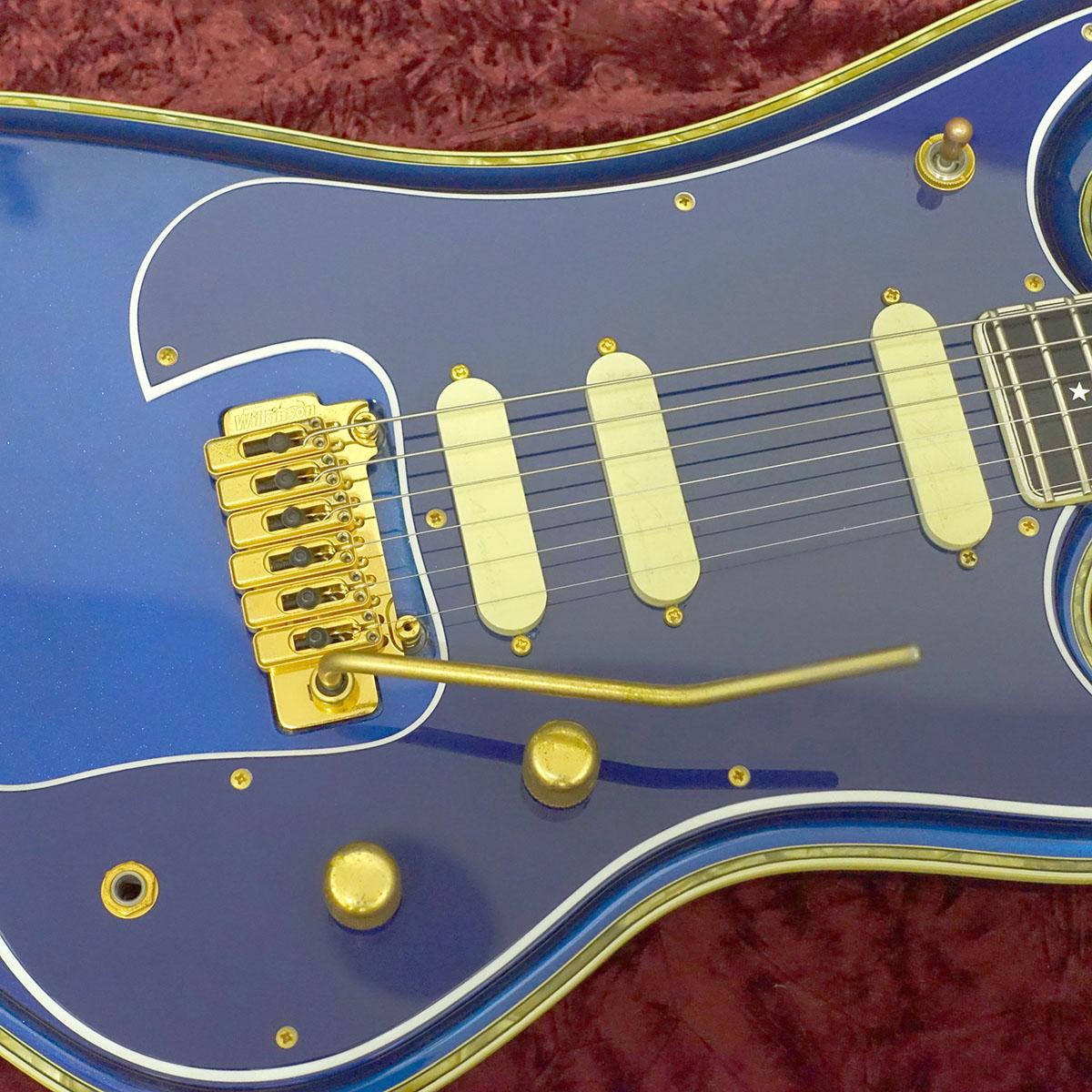 黒黒としたエボニー指板には比較的小ぶりな星型インレイが輝き、こちらもささやかながらゴージャスな意匠となっています。