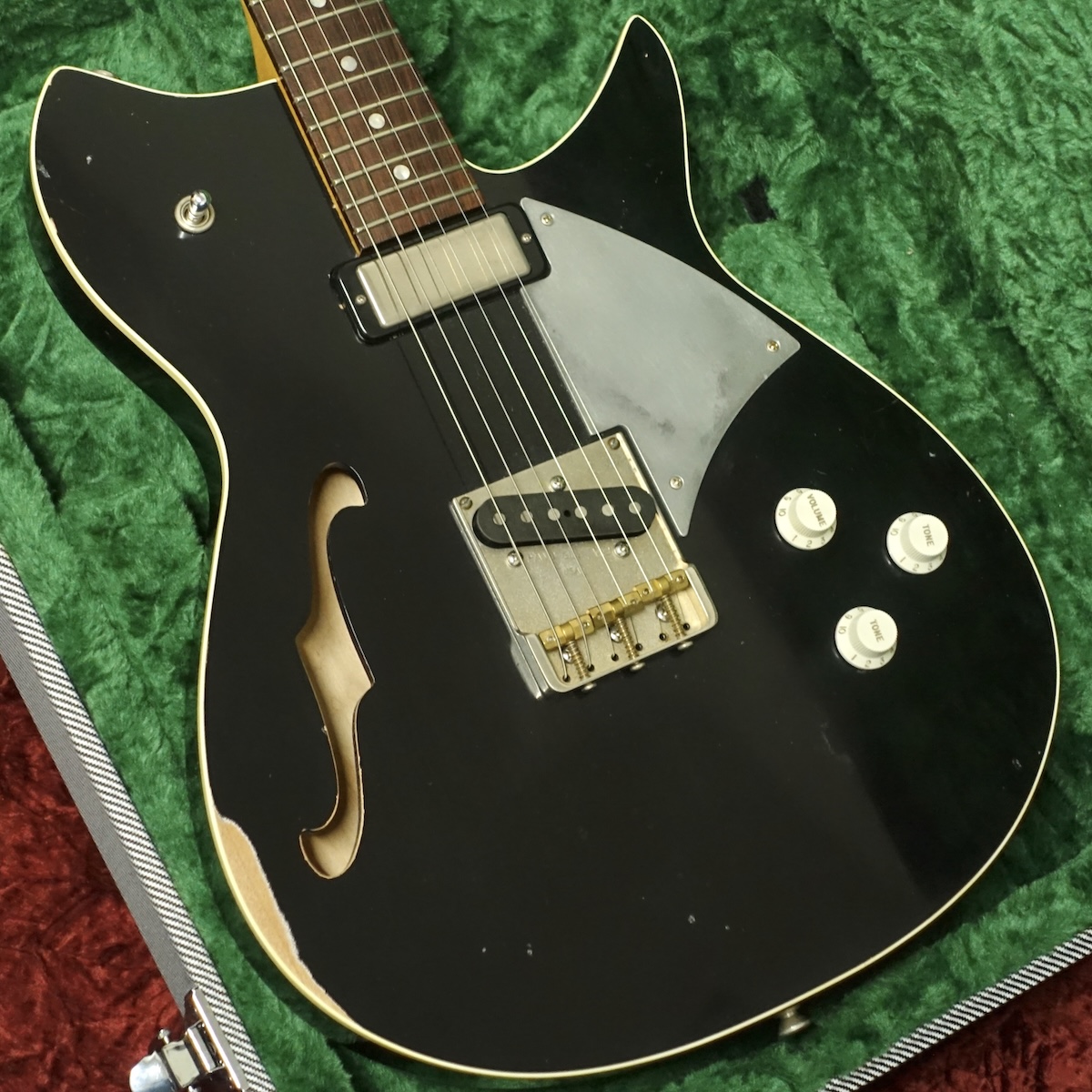本機は大人気のRB6シリーズの中でも、ボルトオンジョイントやTLタイプのブリッジとサドルなど、Fender要素がやや強めなRB6T。リッケンバッカーを思わせる独特なシェイプと、わざとらしくない自然なエイジングが最高にクールなルックスです。