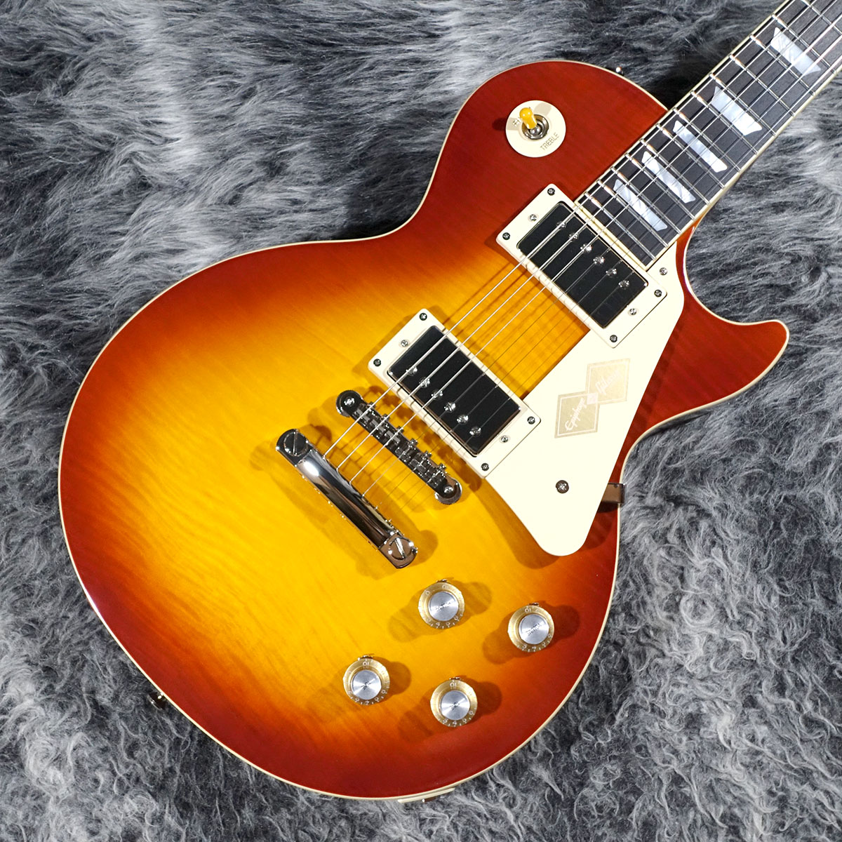 本モデルでは、ワンピース・マホガニー・ネック(ロング・ネック・テノン仕様)を採用し、豊かなサステインを実現。スリムテーパー・ネック・プロファイルにより、スムーズな演奏性を提供します。さらに、バインディングが施されたローズウッド指板、マザー・オブ・パールのトラペゾイド・インレイ、エイジド加工を施したEpiphoneロゴ、ゴールドでシルクスクリーン印刷された「Les Paul Model」の文字が入ったギブソン・スタイルの“オープンブック”ヘッドストックを採用。サイド・ドットの位置やサイズも、1960年当時のLes Paul Standardと同じ仕様になっています。ジェニューイン・マホガニー材のボディにメイプル・トップが貼られ、トップには美しいAAAフレイムメイプル化粧板があしらわれています。