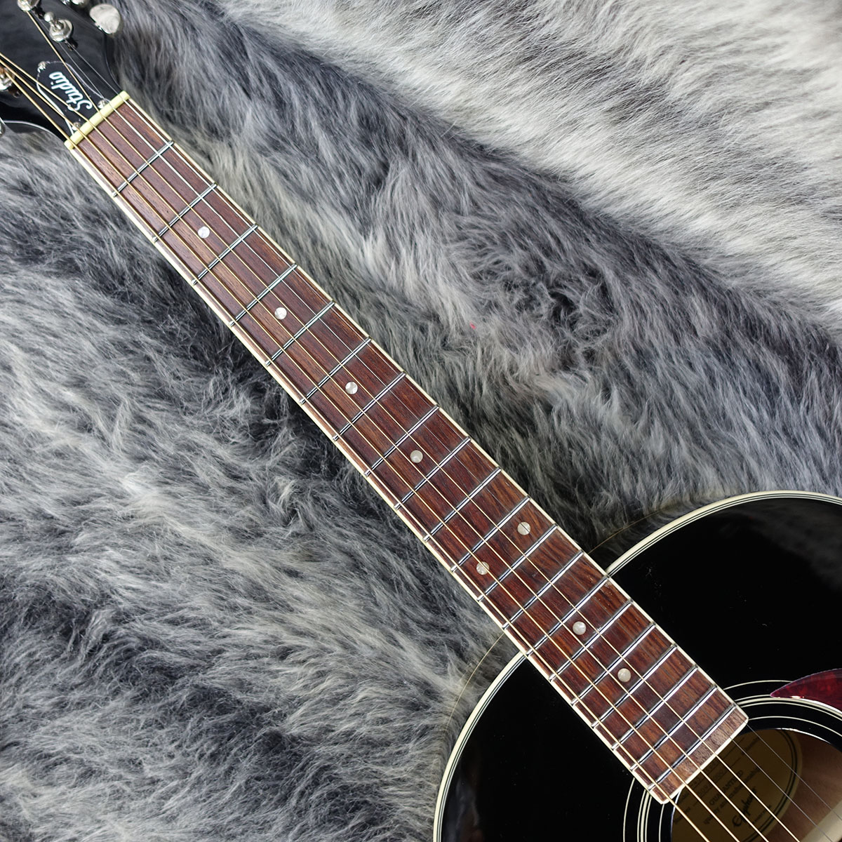 ローズウッド指板には20本のフレットが打たれ、シンプルなパーロイド製のドット・インレイが施されています。