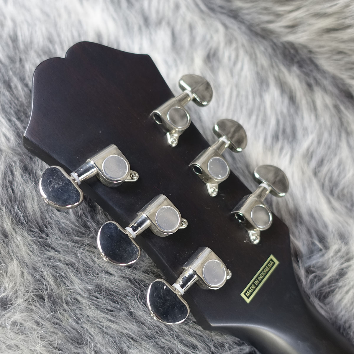 ティアドロップ形でダークなトータスシェル柄のピックガード、アイボリー色のプラスチックボタンを備えた3連チューナー、そして金色のシルクスクリーンによるエピフォン・ロゴと60年代カラマズースタイルのヘッドストック等、ギブソンファン垂涎の仕様内容を誇ります。