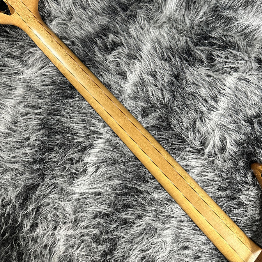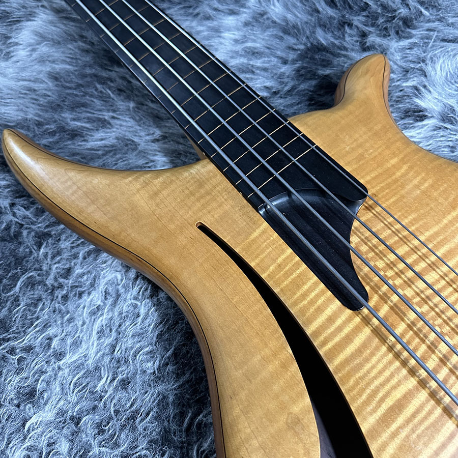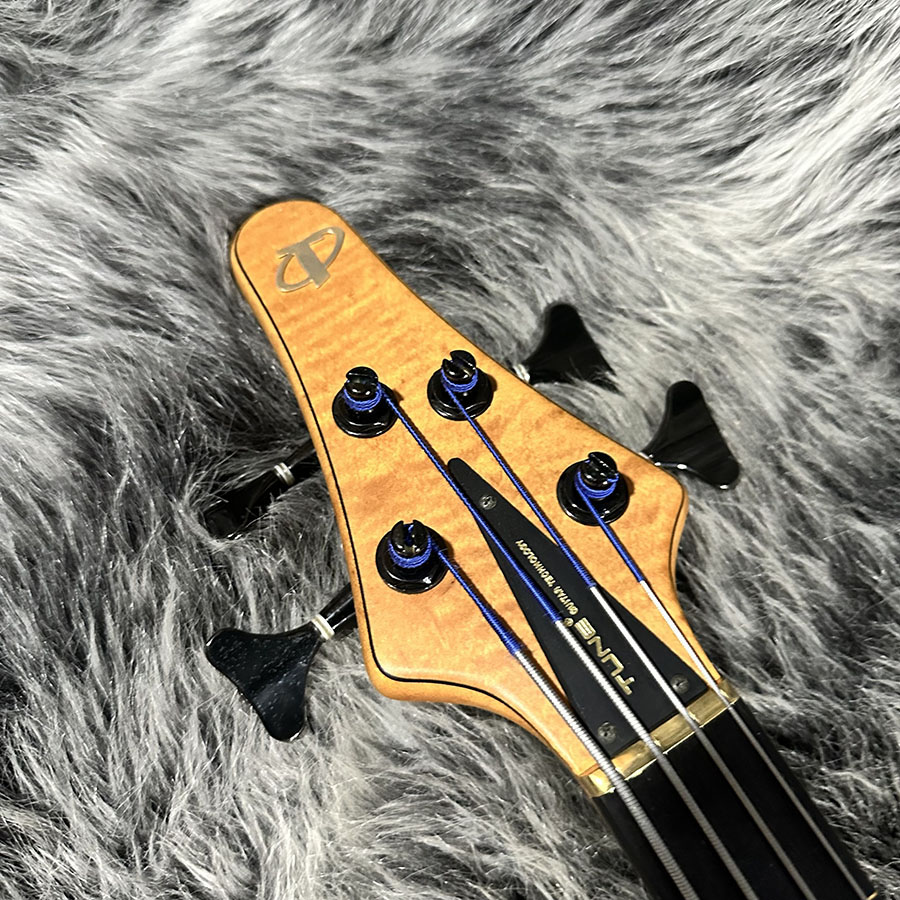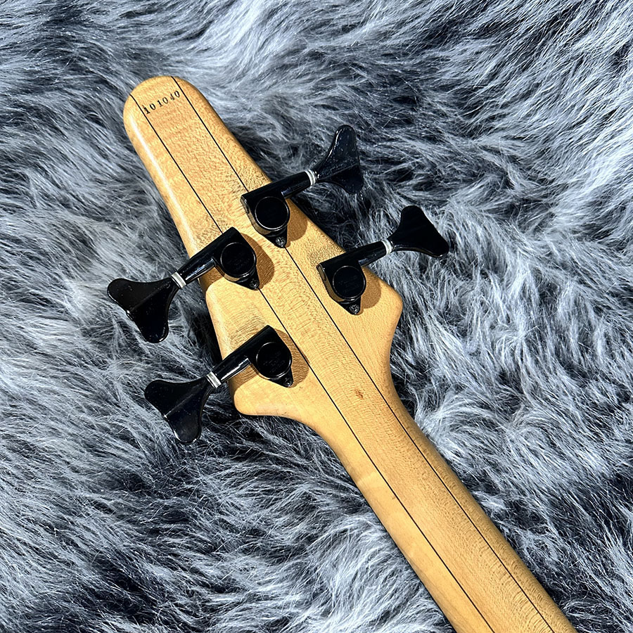 見た目からの判断ですがしっかりと杢の出た美しいフレイムメイプルトップ、アッシュバック、メイプルを使用した5Pネック、エボニー指板のウッドマテリアル。