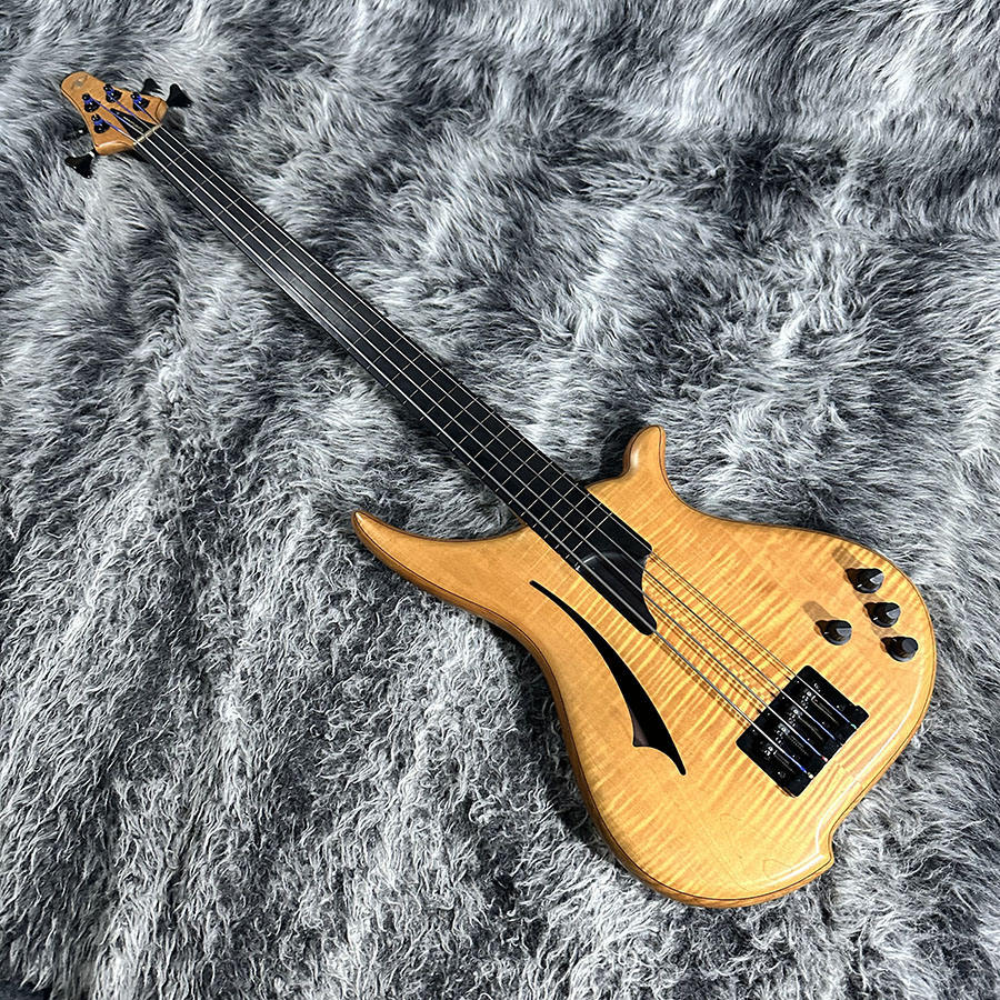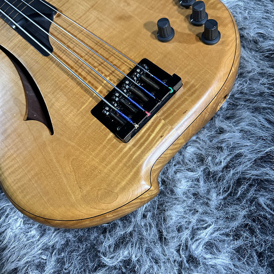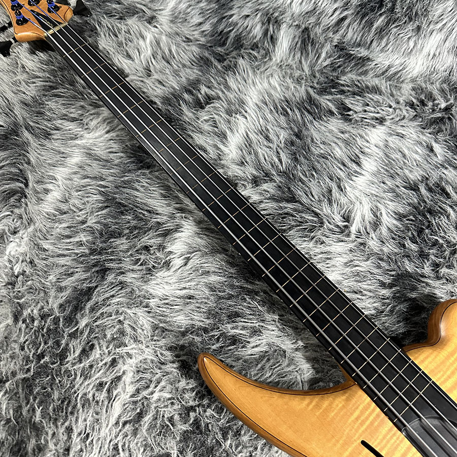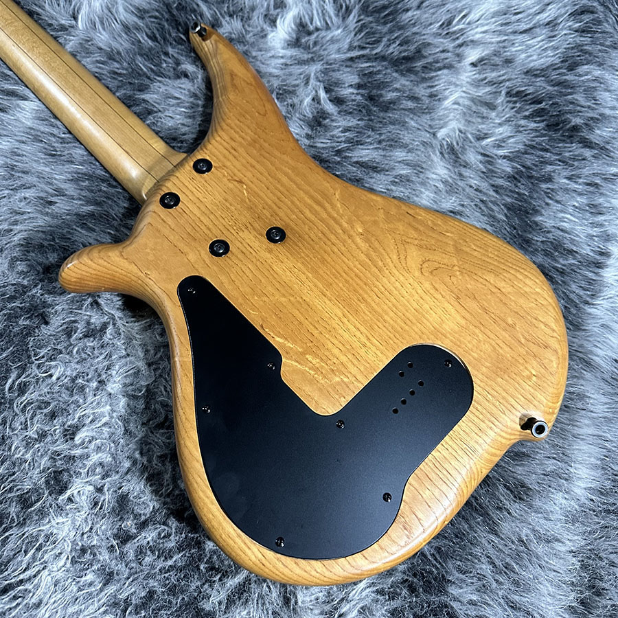 見た目からの判断ですがしっかりと杢の出た美しいフレイムメイプルトップ、アッシュバック、メイプルを使用した5Pネック、エボニー指板のウッドマテリアル。